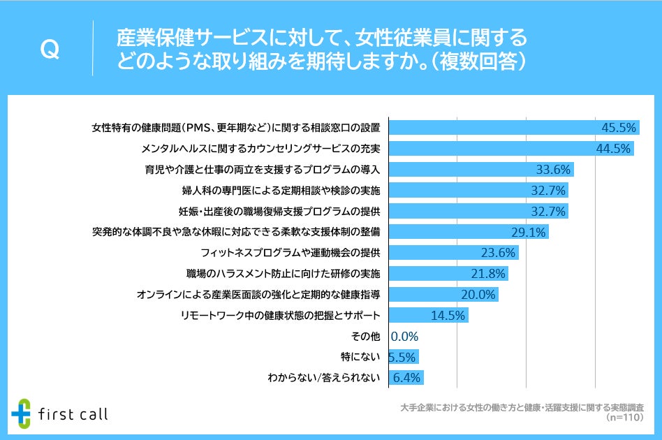 最後に、「産業保健サービスに対して、女性従業員に関するどのような取り組みを期待するか」について調査したところ、「女性特有の健康問題(PMS、更年期など)に関する相談窓口の設置」が45.5%、「メンタルヘルスに関するカウンセリングサービスの充実」が44.5%、「育児や介護と仕事の両立を支援するプログラムの導入」が33.6%となりました。