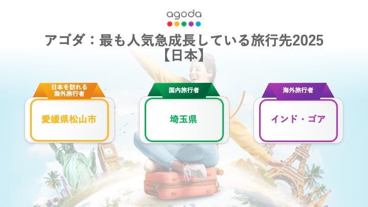 最新の「New Horizons」によると、「愛媛県松山市」が日本を訪れる海外旅行者にとって最も急成長している観光地として第1位に選ばれ、また、日本人の国内旅行者にとって最も注目されている都市は「埼玉県」となりました。さらに、インドの「ゴア」は日本人旅行者の間で人気が急上昇している国際的な観光地となっています。