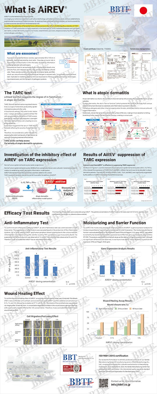 今回、新たにAiREV®の有効性試験を実施し、炎症抑制効果や保湿・バリア機能促進効果、創傷治癒効果などの有効性を評価・確認し、その結果を公開しました。
