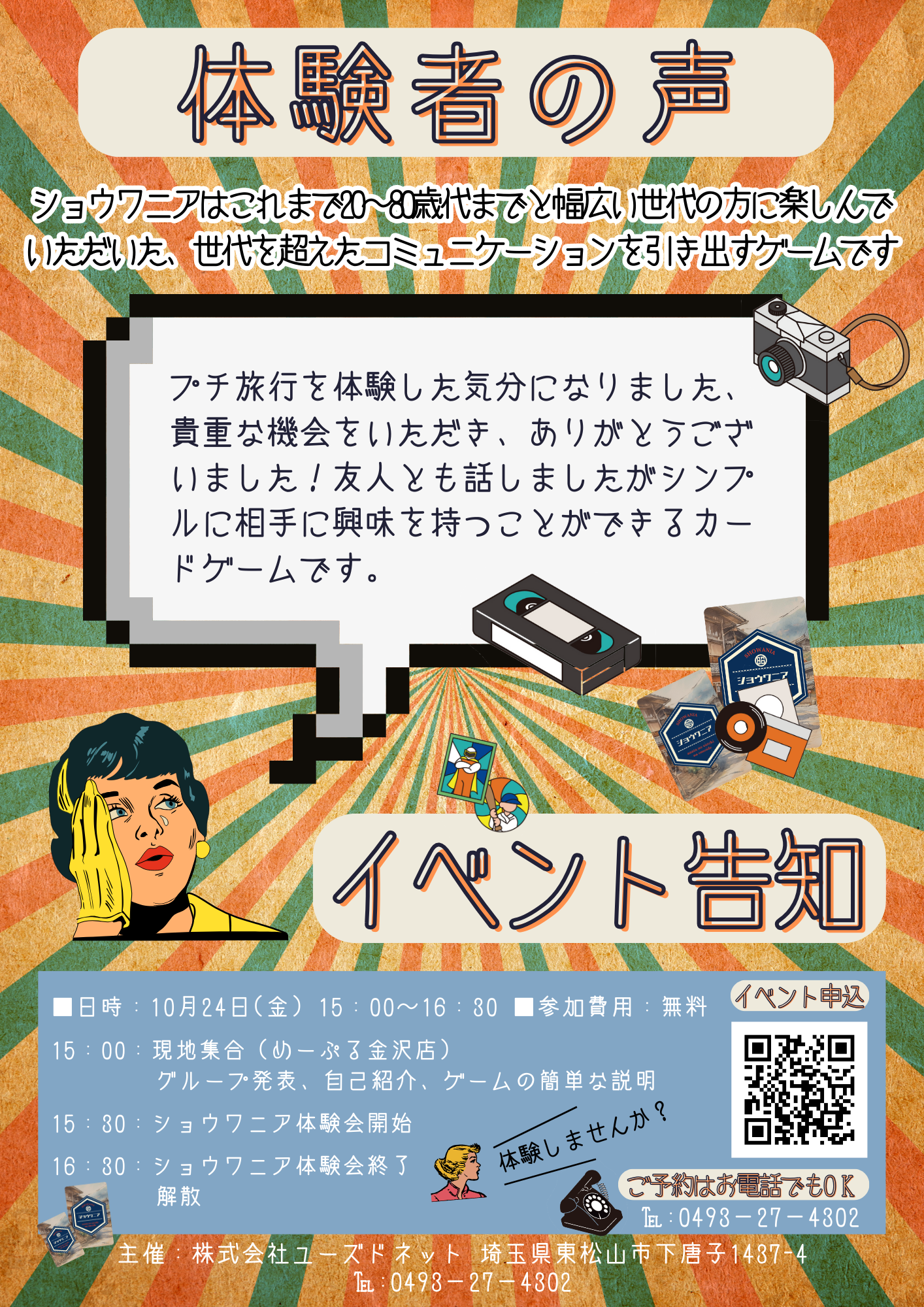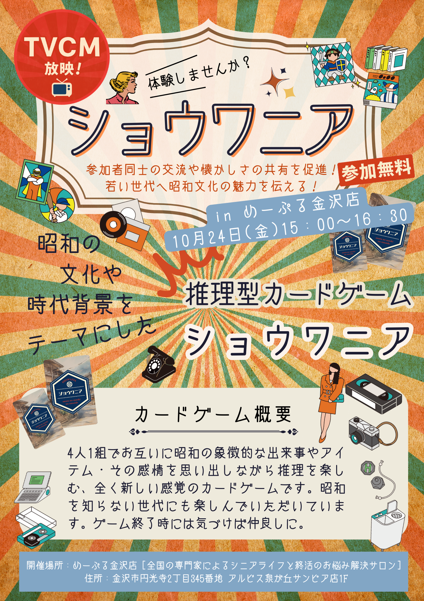 埼玉県東松山市の徳田真人と申します。10月25日、金沢市のめーぷる金沢店と協力し、高齢者の「思い出」を引き出すカードゲーム「ショウワニア」の体験会を行いますのでお知らせします。