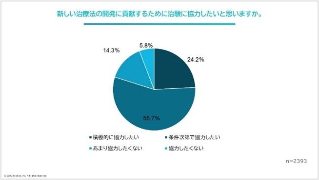 ・また新しい治療法の治験に対し、24.2%が「積極的に参加したい」、55.7%が「条件次第で協力したい」と回答。