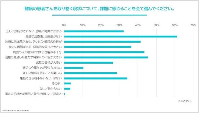 ・現状の課題は、61.2%が、「最適な治療法、治療薬がない」と回答。45.3%が、「治療の見通しが立たず将来への不安が大きい」と回答。43.5%が、「周囲の人の病気に対する理解が不十分」と回答。