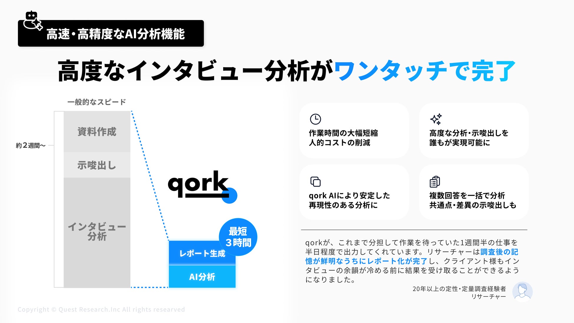 qorkの活用によって、弊社リサーチャーによる定性調査(オンラインインタビュー)は短納期・高効率・高精度でのアウトプット創出を実現できており、クライアント企業様からも高い評価をいただいております。