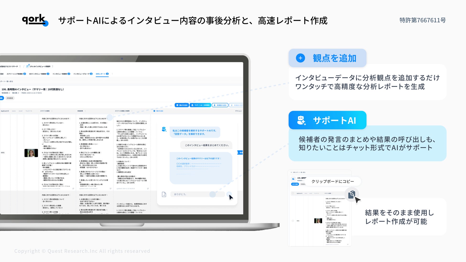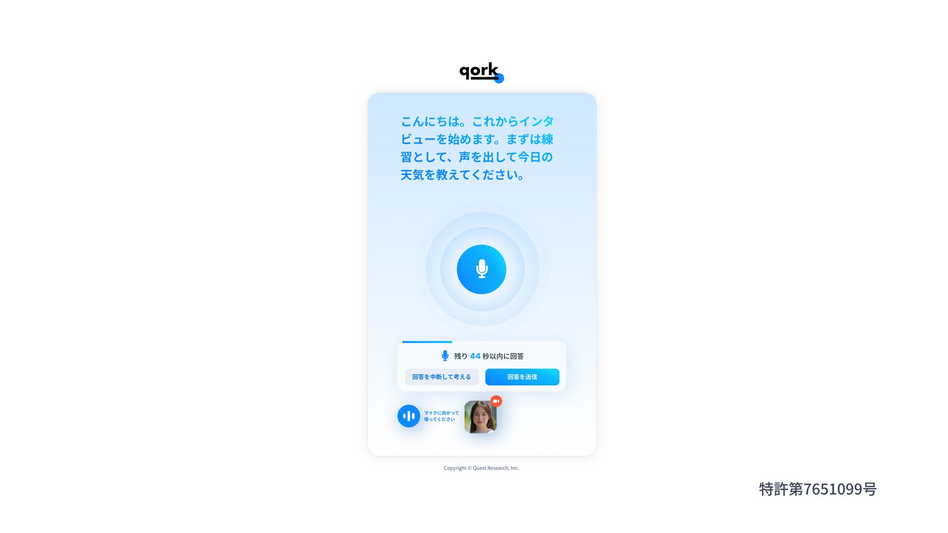株式会社Quest Research(本社:東京都港区、代表取締役:南健太)は、生成AIを活用したインタビューサービス「qork(コルク)」に関する独自技術で特許を取得したことをお知らせします。