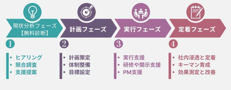 本サービスでは、「専任がいなくても、社内を動かし、成果を出す」ことを目的に、計画策定から実行、キーマン育成まで一貫して伴走支援。兼任/兼務の業務で、限られた時間内に、効率的かつ継続的に進められるよう支援します。