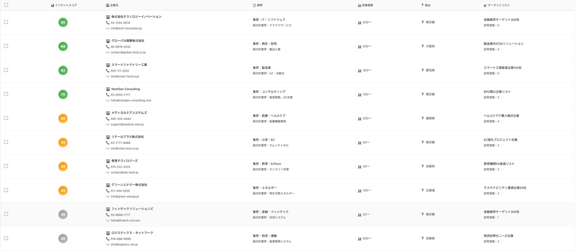 ダッシュボードで、スコア順に「今アプローチすべき企業リスト」を常時確認できます。
