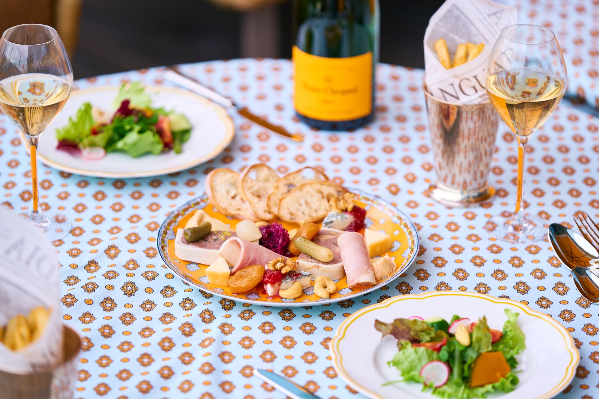 特別なピクニックバスケットには、ウォルドーフ・アストリア大阪のロゴパッチが施されたアイスジャケット付き「ヴーヴ・クリコ イエローラベル」のボトルとグラス、さらにフランス・プロヴァンスの名門ブランド「SOULEIADO(ソレイアード)」とのコラボレーションによる華やかなテーブルクロスとプレートが入っています。鮮やかなデザインが南仏のエスプリを感じさせ、都会のテラスでのピクニックをより特別なものに演出します。