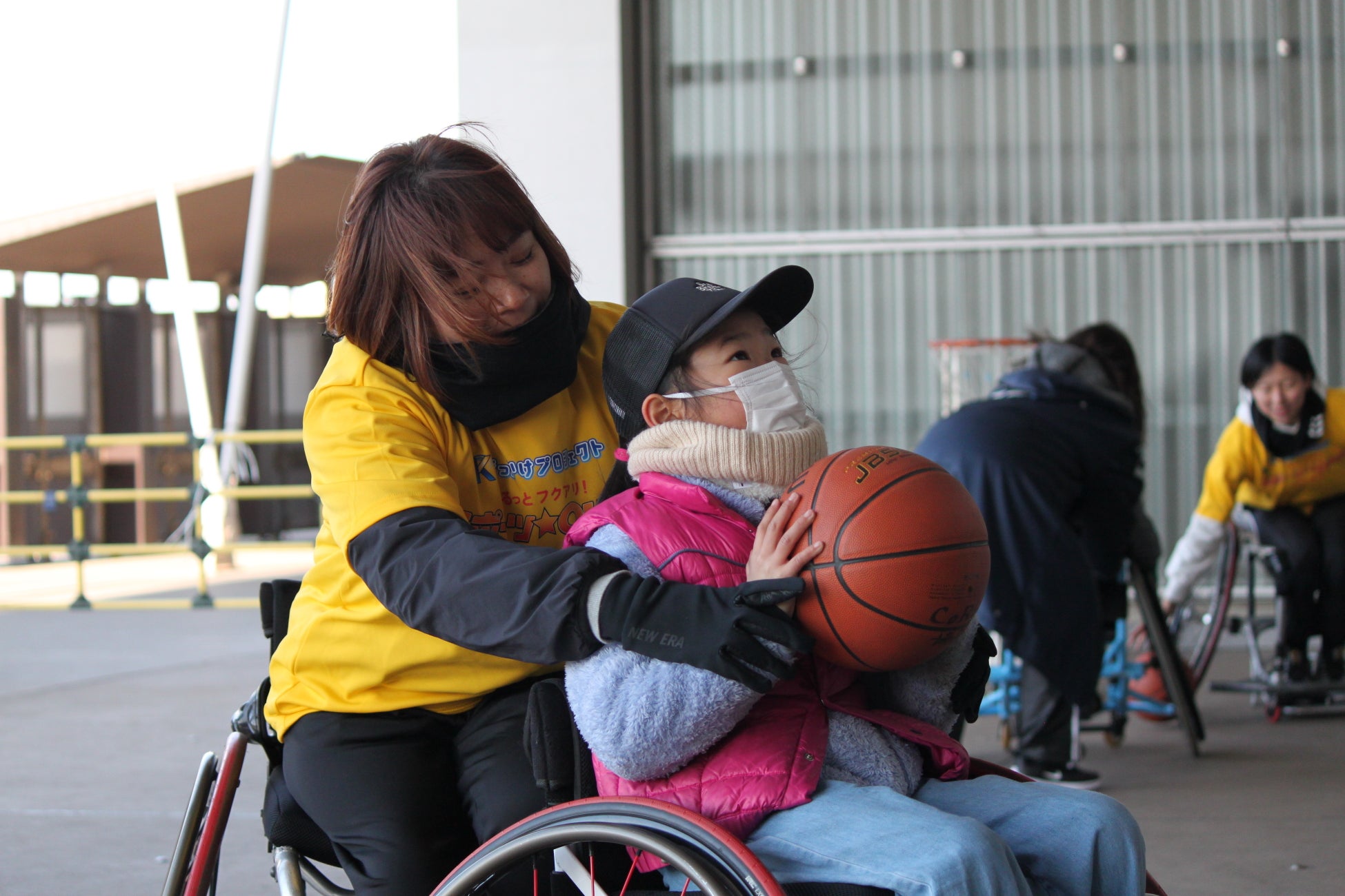 競技用車いすに乗り、シュートやパス、ドリブルなどの基本動作を体験しながら、車いすバスケットボールの楽しさを体験するコーナーです。本コーナーでは、車いすバスケットボール元日本代表の藤井郁美さんと、現役選手の菅野美和子さんに講師を務めていただきました。