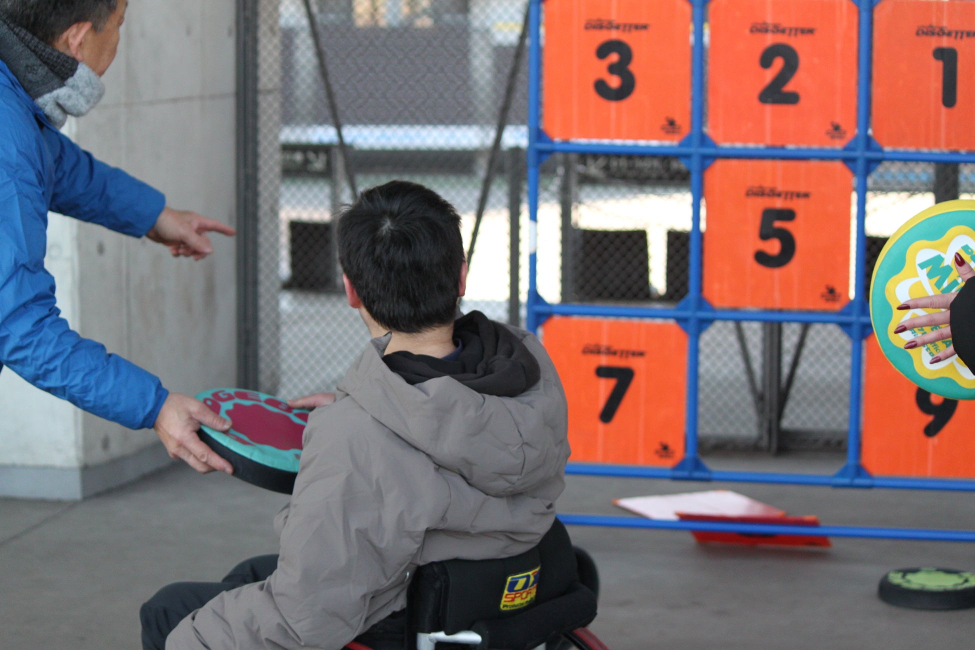 「投げる」体験では的をねらってディスクを投げる、ストラックアウトゲームに挑戦。