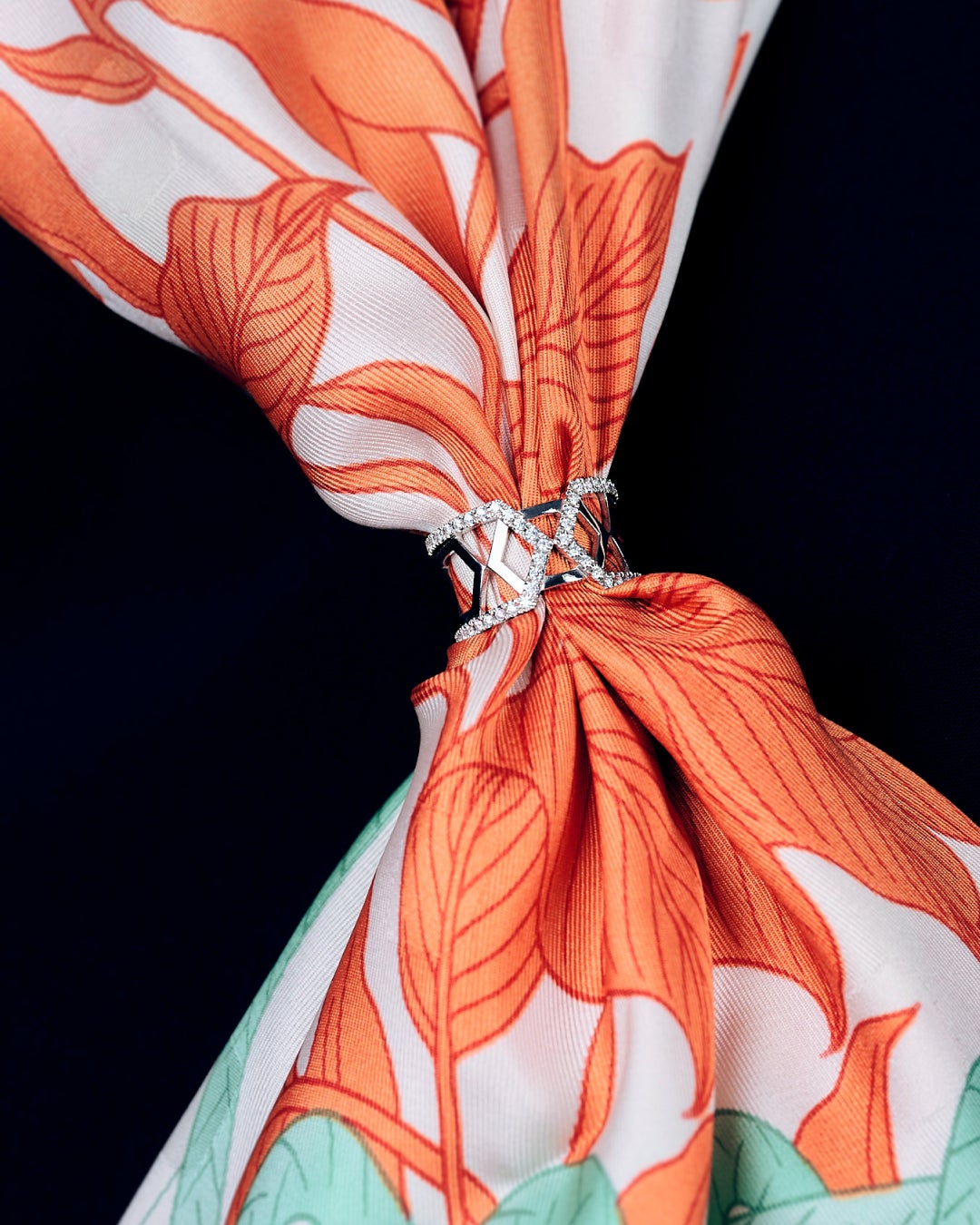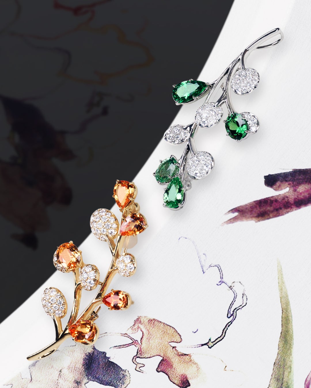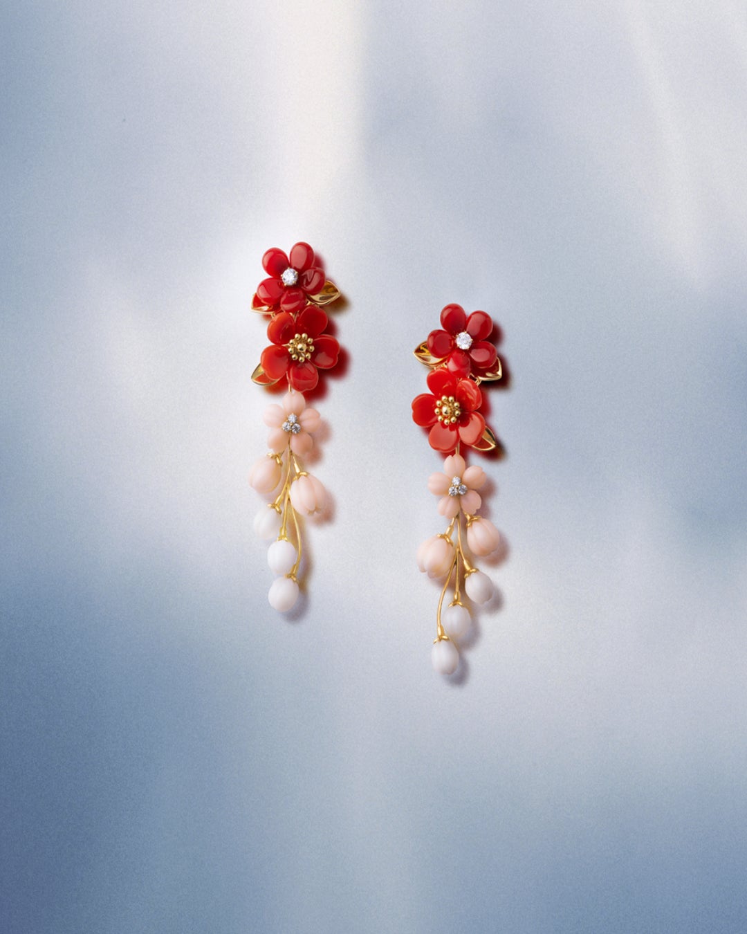 絹の質感や文様がジュエリーの造形と呼応し、光と色が静かに溶け合う。そこには、四季の移ろいや自然のかすかな変化に美を見出す、 日本ならではの感性が息づいています。