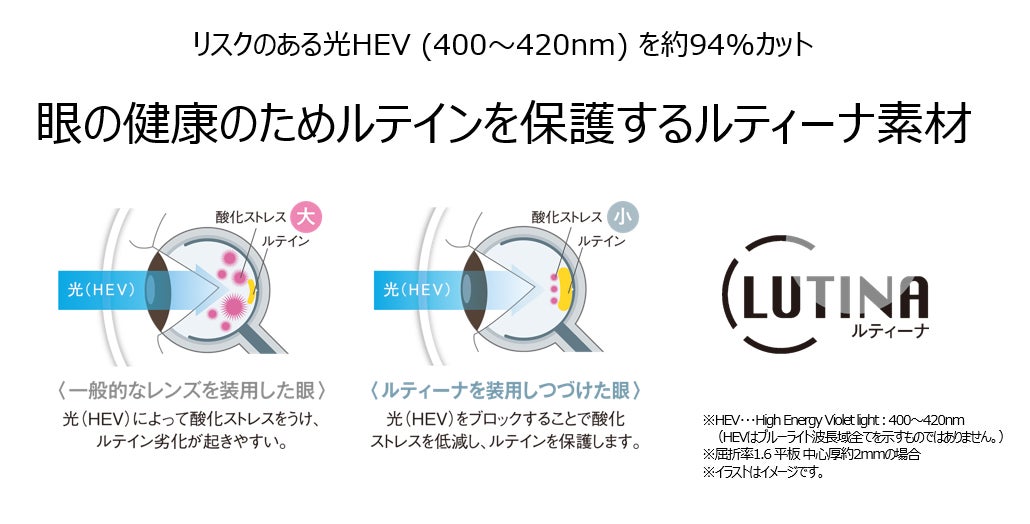 さらに、ルティーナ素材により、眼の健康のためにルテインを保護するレンズとして、リスクのある光HEV(※2)を約94%カットし、まぶしさ軽減と眼の健康を考えたワンランク上の調光レンズを実現しています。