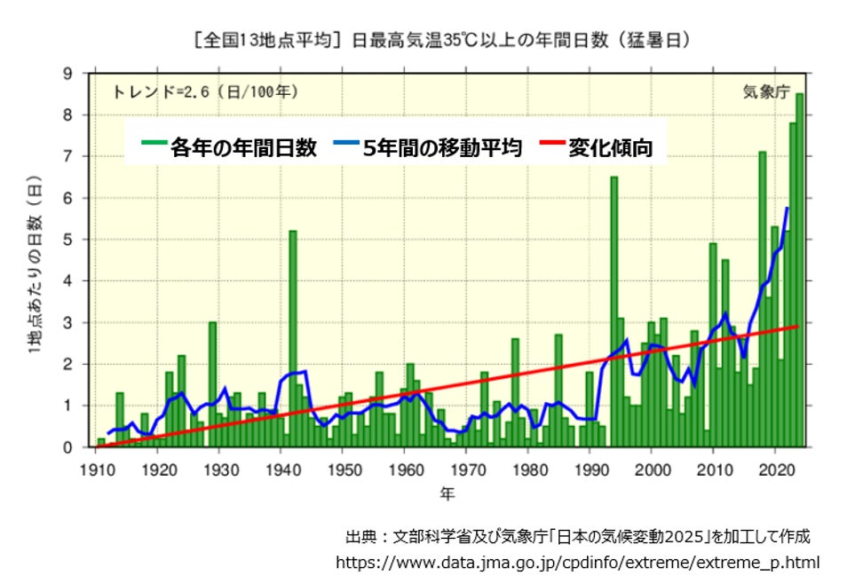 また、近年の気候の変化に目を向けると、世界では地球温暖化の影響もあり平均気温は年々上昇し、日本では最高気温35℃以上の猛暑日が年々増加しています。