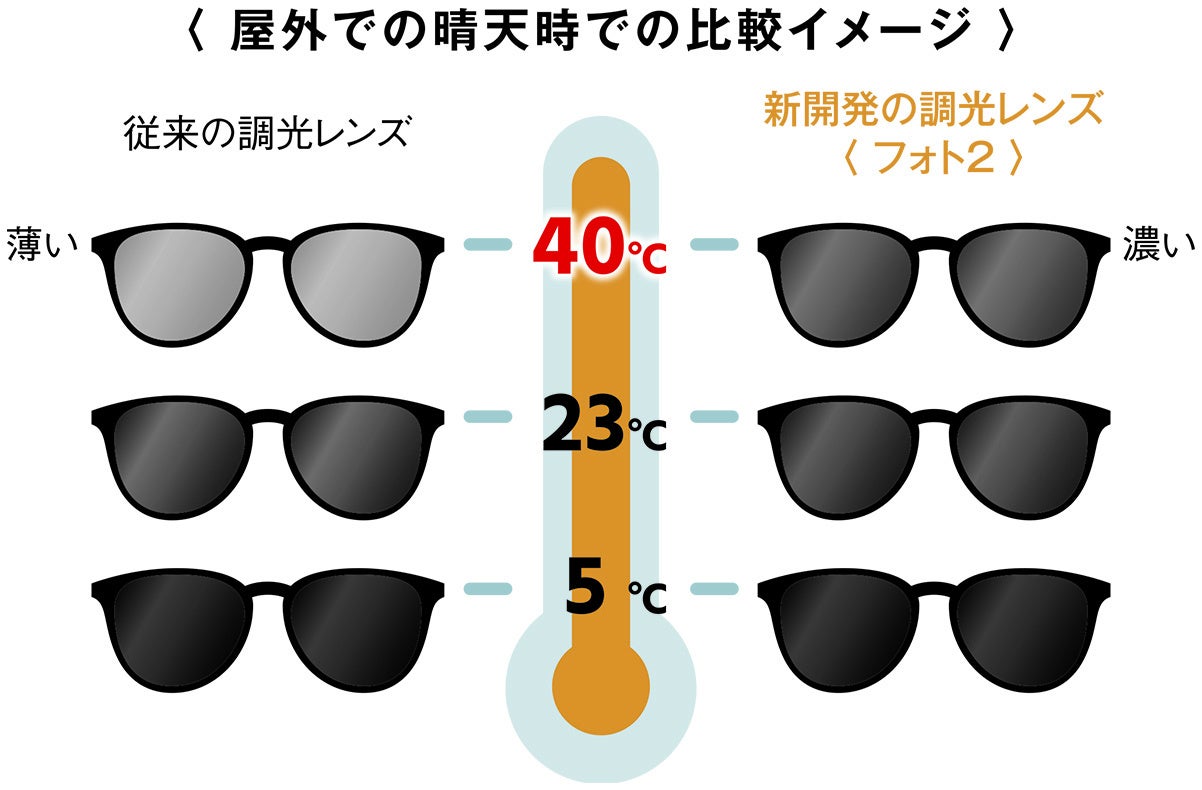 従来の調光レンズは、室内ではクリアに、屋外ではサングラスに変化するというメリットがある一方で、気温が高いとレンズの色があまり濃くならないというデメリットがあり、気温が高いと濃いサングラスとして使えないという弱点がありました。