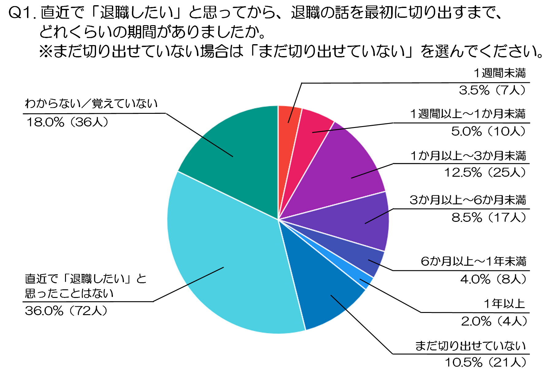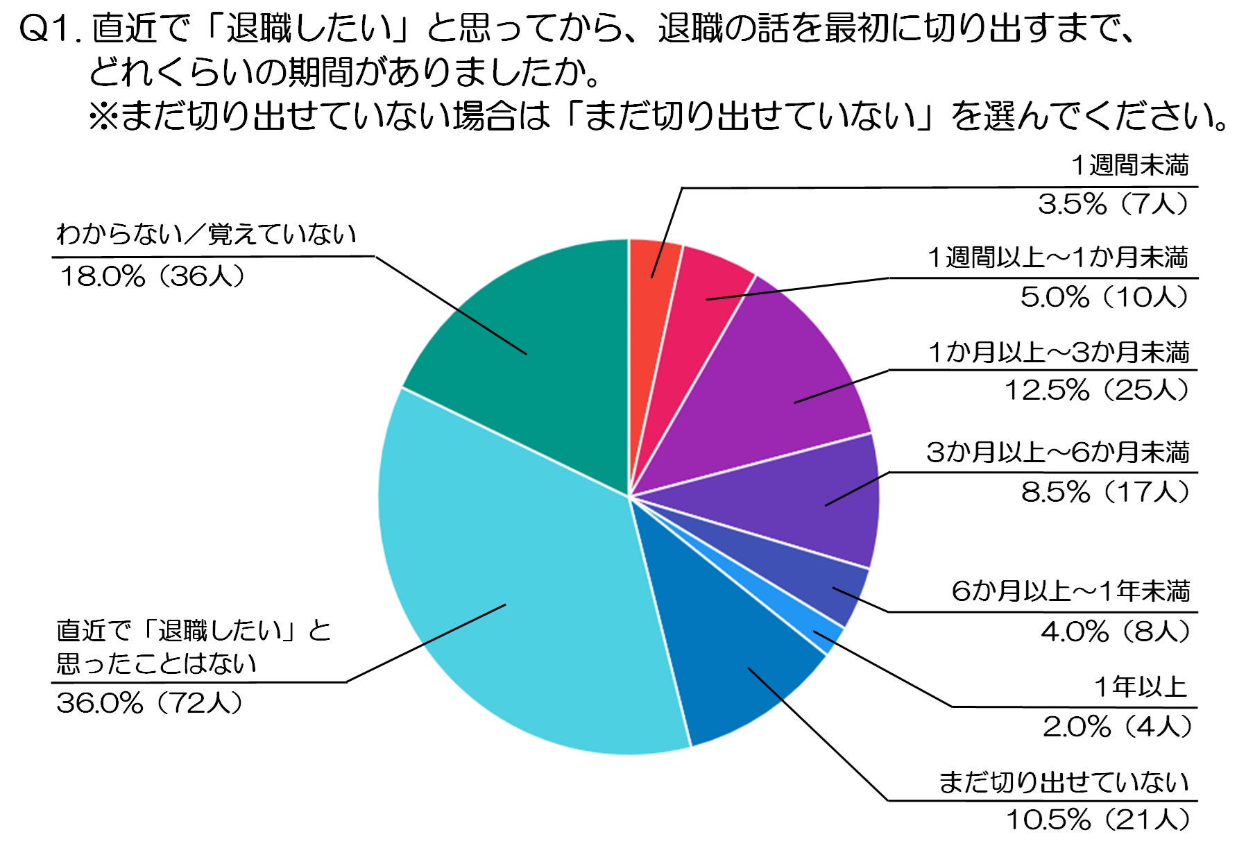 これに対して、「1週間未満」が3.5%(7人)、「1週間以上〜1か月未満」が5.0%(10人)と、比較的スムーズに切り出せている人は少数派であり、多くの人にとって退職の意思表示は簡単ではないことがわかります。