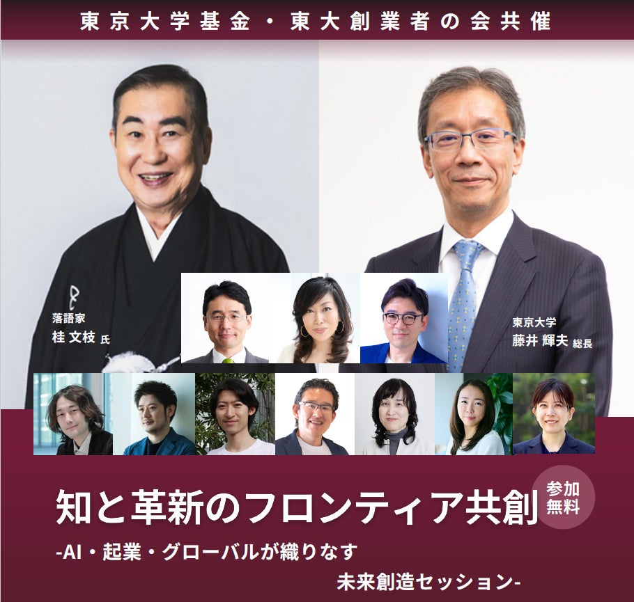 東京大学総長、理事、ユーグレナ出雲代表のスピーチ、AI起業家のピッチ、女性起業家のセッションなどに加えて、特別企画としてGoogleと吉本興業のコラボによりAIを活用した落語セッションに桂文枝氏をお招きして公演いたします。卒業生起業家を含めた外部とともに知と革新のフロンティア共創に向けて、変わろうとする東京大学の挑戦をお伝えします。