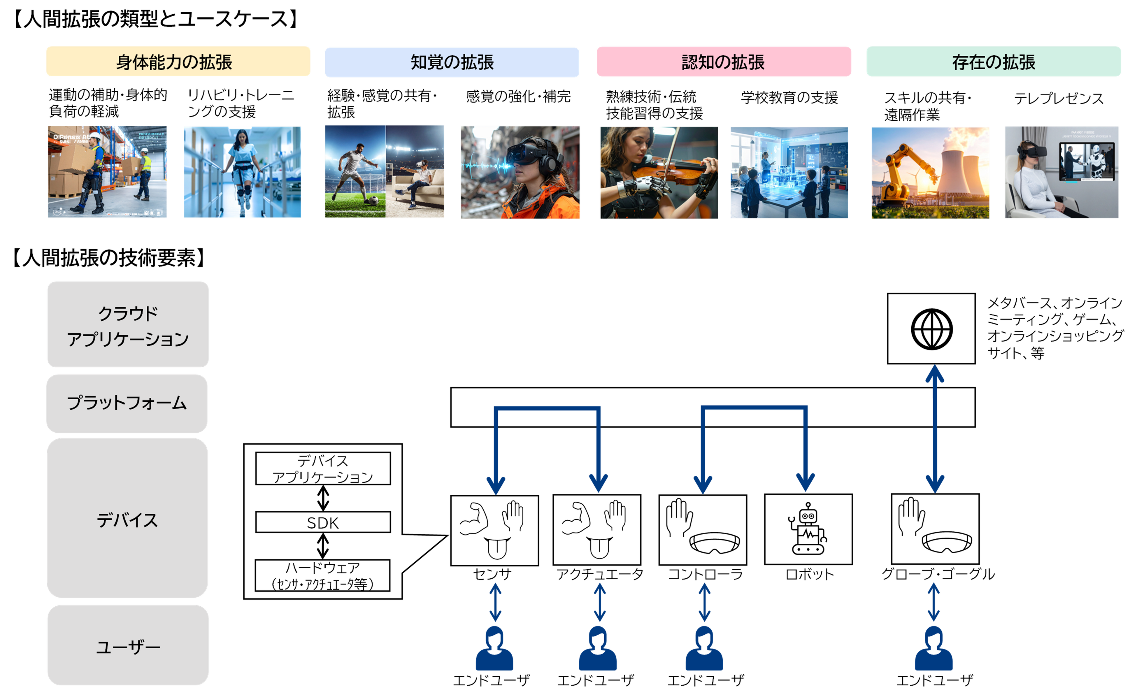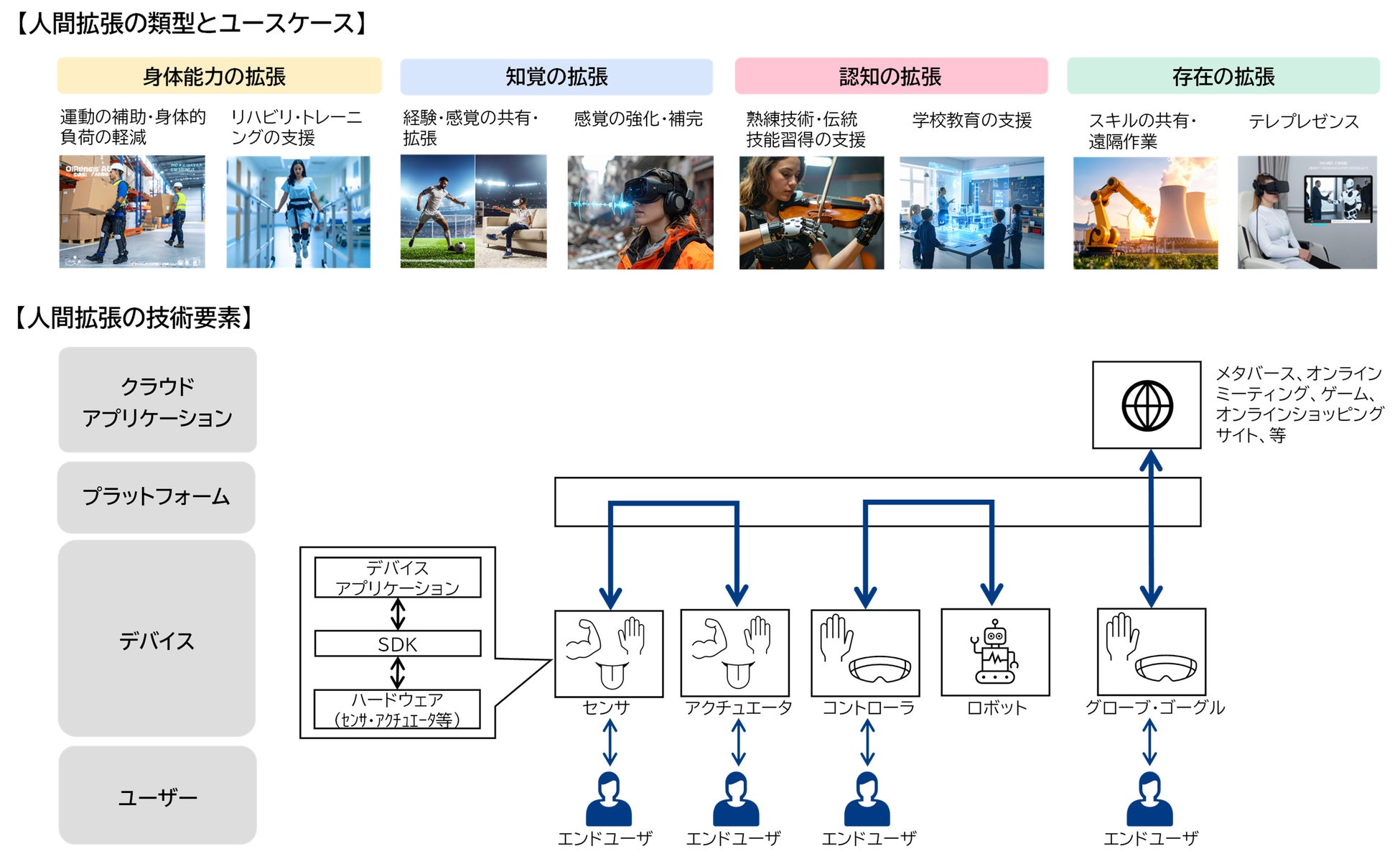 人間拡張コンソーシアム白書では、人間拡張の定義・類型(身体能力、認知、知覚、存在の拡張)、類型ごとのユースケース、技術要素(クラウドアプリケーション、デバイス、プラットフォームなど)、標準化動向、ELSIなどについて整理しています。2025年10月にVer.1を発行後、随時改訂を進めており、最新版はVer.2です。以下URLよりご覧いただけます。