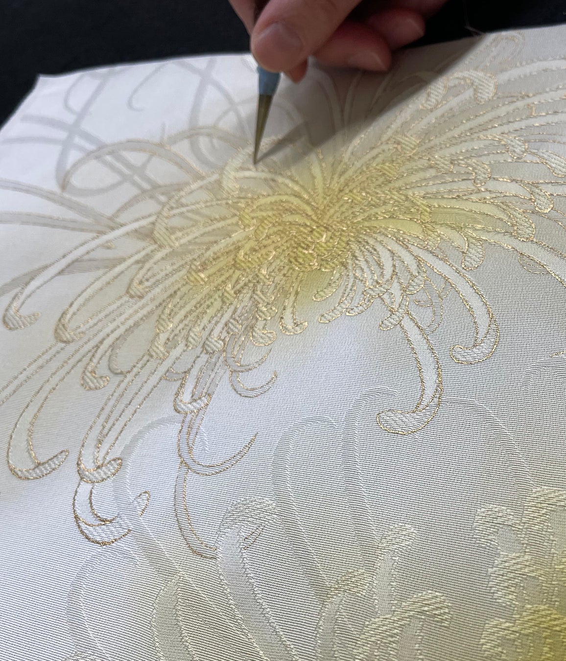 京都ゾーンにおける「一座建立」の意識を持ち、作品展示の紹介に加え、来場者と交流し心を通わせることに努め、自ら筒描きの実演をしつつ、日本語・英語の双方で語りかけ、来場者にも金線描きを体験(無料)していただきます。実演時、体験時ともに、京都の丹後ちりめん紋意匠「月華舞菊」を使用し、絹に触れる貴重な機会をご案内します。