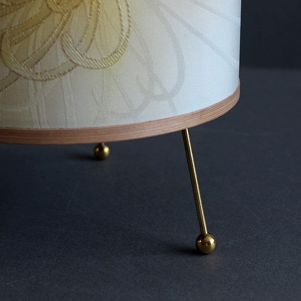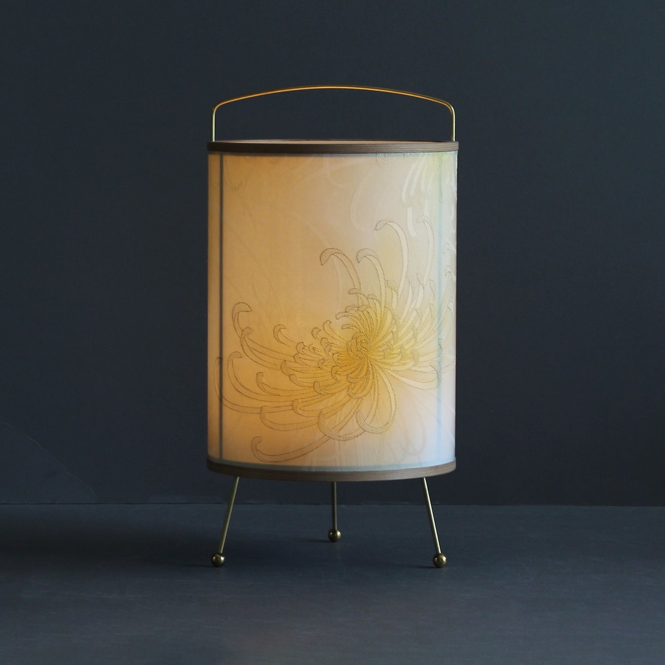 着物の代表的な素材である、京都の丹後ちりめんをセードとして使用し、京指物のフレームにおさめながら、現代空間に合う行燈に仕上げた作品。丹後ちりめんの地紋は「月華舞菊」という伊と幸図案家によるオリジナル紋意匠で、その織り紋様を、手染めのぼかし染めで、ふんわりとなぞっています。さらに花びらの輪郭に、ごく繊細な金細線で筒描きすることで、月華舞菊ののびやかな花弁が、光を通して浮かび上がる効果を持たせます。行燈の骨組みには釘ビス類を使用せず、吉野杉の木と木を指し合わせる「京指物」で制作し、かつ、脚部や持ち手を真鍮製とすることで、現代空間、洋室にもなじむ作品に仕上げました。光源は全世界対応のUSB仕様。<地紋様は廣田真理子(㈱伊と幸 図案家)、ぼかし染めは、木村むつみ(㈱木村染匠)、金細加工は、志賀豊(伝統工芸士”京の名工”瑞宝単光章受章)、京指物は㈱興石(数寄屋建築中村外二工務店関連会社)>