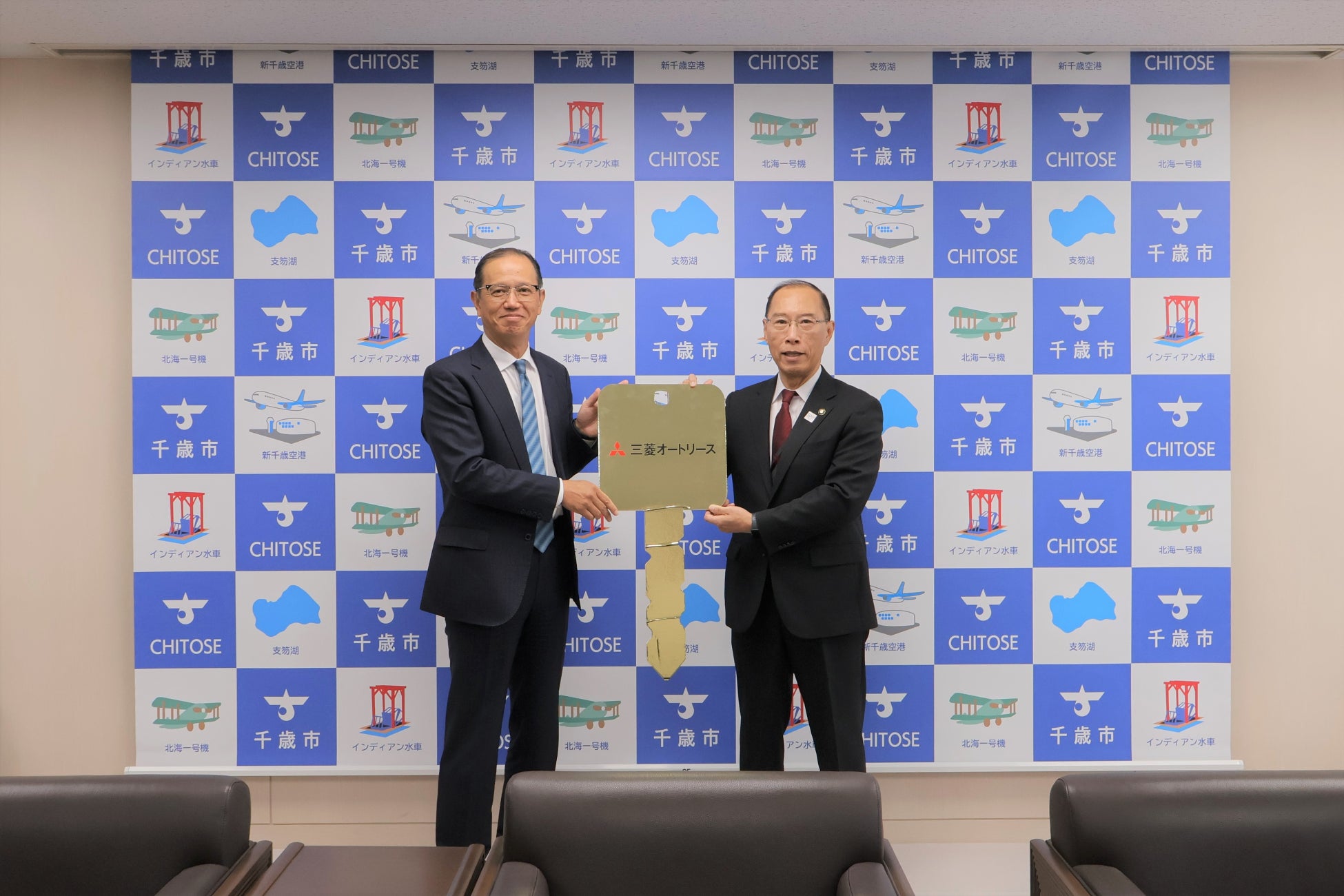 ✓2025年11月25日、レプリカキーを千歳市に贈呈する様子です。