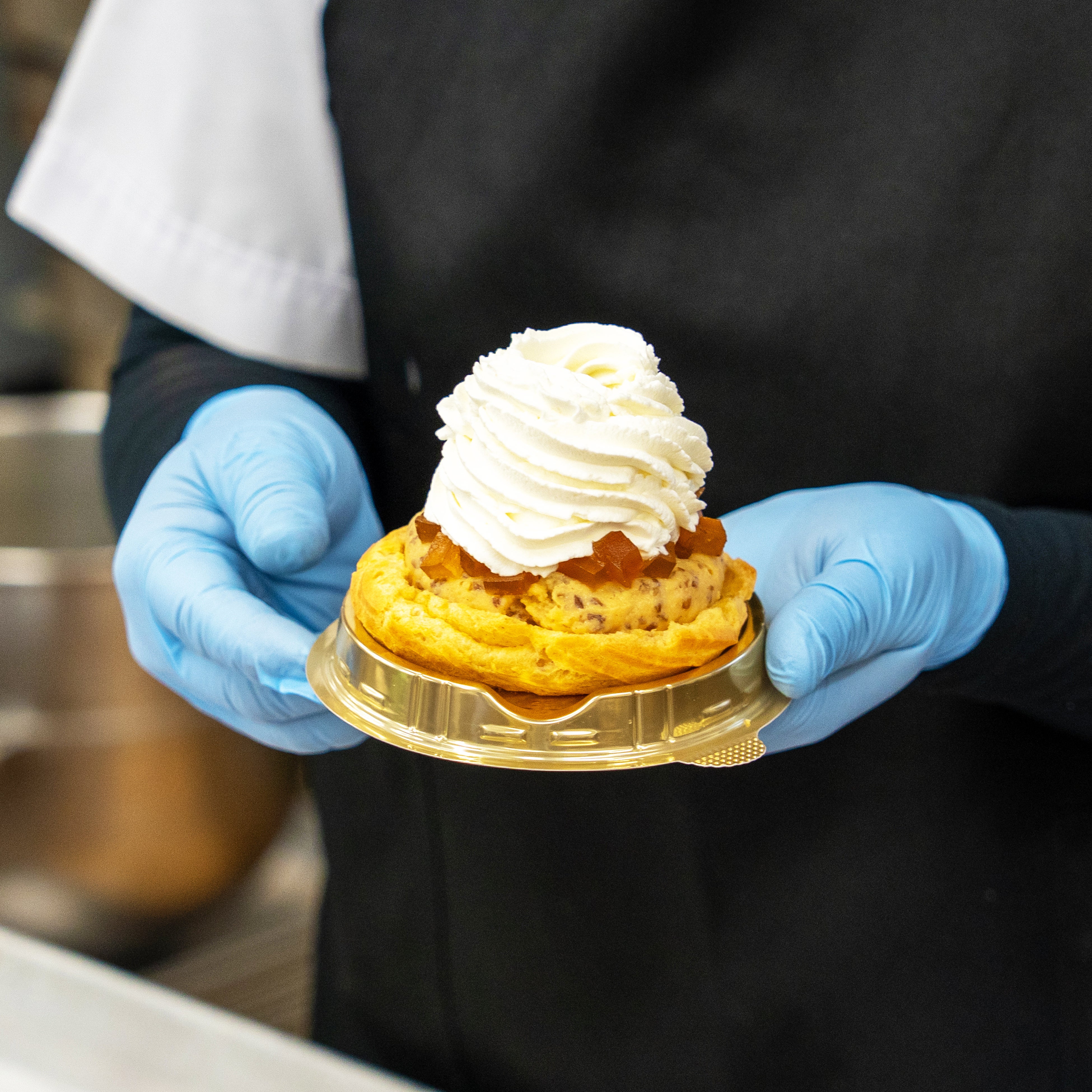 そば粉を練り込んだシュー生地に、山形名産の「のし梅」を組み合わせた、和と洋の境界を超える新感覚のスイーツ。