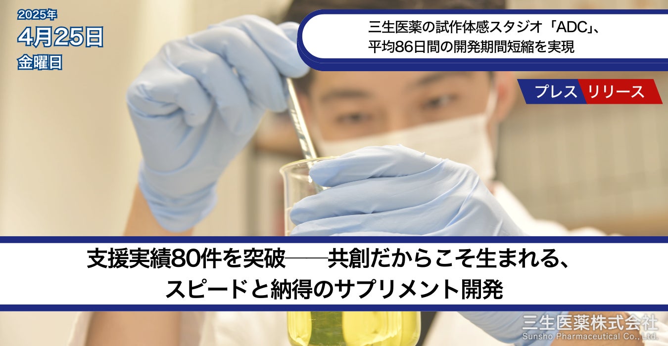 三生医薬株式会社(本社:静岡県富士市、代表取締役社長:今村 朗)は、東京都品川区で運営するサプリメント試作体感スタジオ「ADC(Application Development Center)」(所在地:東京都品川区大井1-31-1 シティタワー大井町1階)において、支援した製品の累計上市件数が80件を突破したことをお知らせいたします。