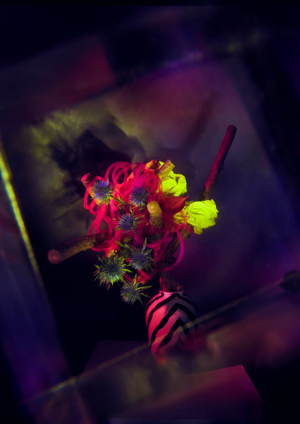 「二度と同じ瞬間は再現できない」という思想を基盤とした本作品は、伝統的な華道を現代的に再構築し、日本の精神性を反映した唯一無二の作品の一瞬の美しさをカメラで捉えた本作品は、照明を当てることで自ら発光するような不思議な明るさを放つ特殊な印刷技術にて出力しています。