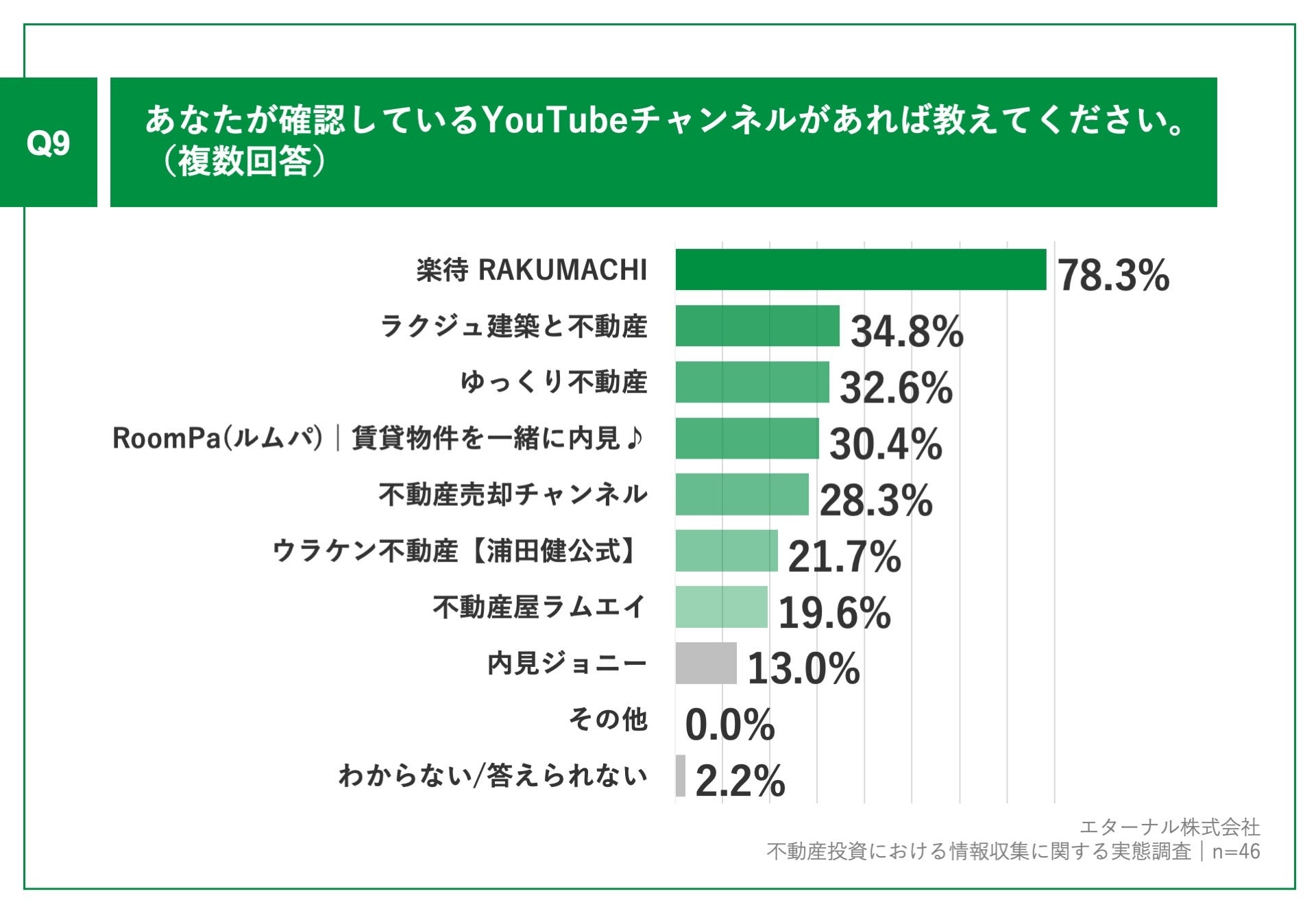 Q1で、不動産投資に関する情報収集手段として「YouTubeの投資関連チャンネル」を選択した方に、「Q9.あなたが確認しているYouTubeチャンネルがあれば教えてください。(複数回答)」