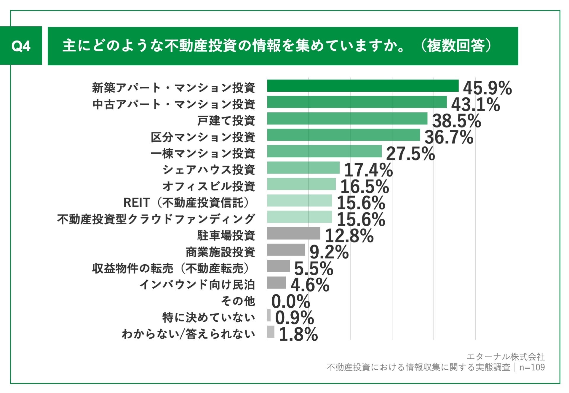 Q1で「特に情報収集はしていない」「わからない/答えられない」以外を回答した方に、「Q4.主にどのような不動産投資の情報を集めていますか。(複数回答)」(n=109)と質問したところ、「新築アパート・マンション投資」が45.9%、「中古アパート・マンション投資」が43.1%、「戸建て投資」が38.5%という回答となりました。
