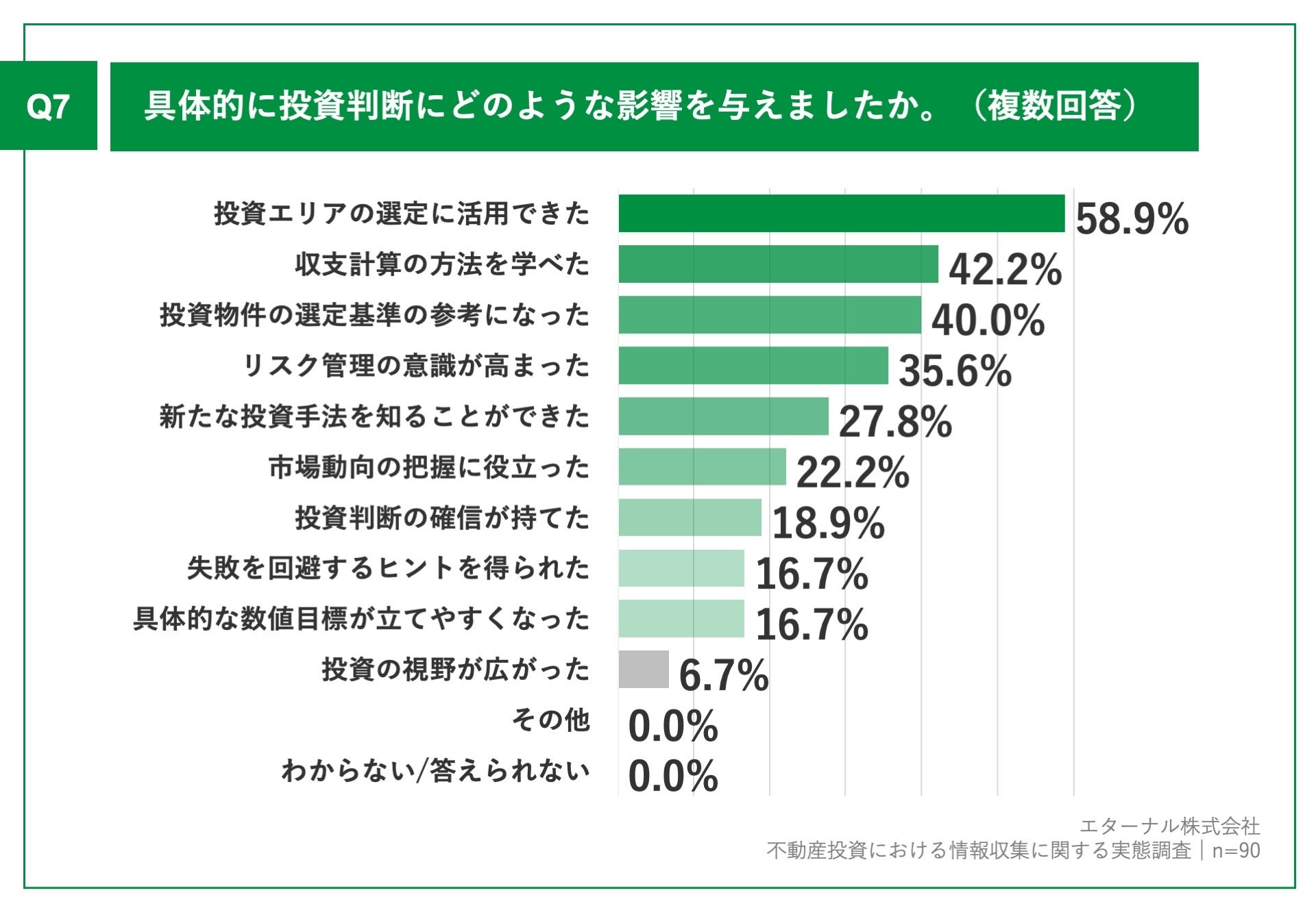 Q6で「非常に影響を与えている」「ある程度影響を与えている」と回答した方に、「Q7.具体的に投資判断にどのような影響を与えましたか。(複数回答)」(n=90)と質問したところ、「投資エリアの選定に活用できた」が58.9%、「収支計算の方法を学べた」が42.2%、「投資物件の選定基準の参考になった」が40.0%という回答となりました。
