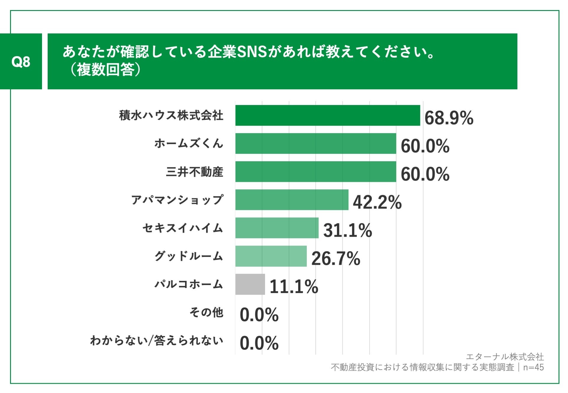 Q1で、不動産投資に関する情報収集手段として「InstagramやX(旧Twitter)などのSNS」を選択した方に、「Q8.あなたが確認している企業SNSがあれば教えてください。(複数回答)」(n=45)と質問したところ、「積水ハウス株式会社」が68.9%、「ホームズくん」が60.0%、「三井不動産」が60.0%という回答となりました。