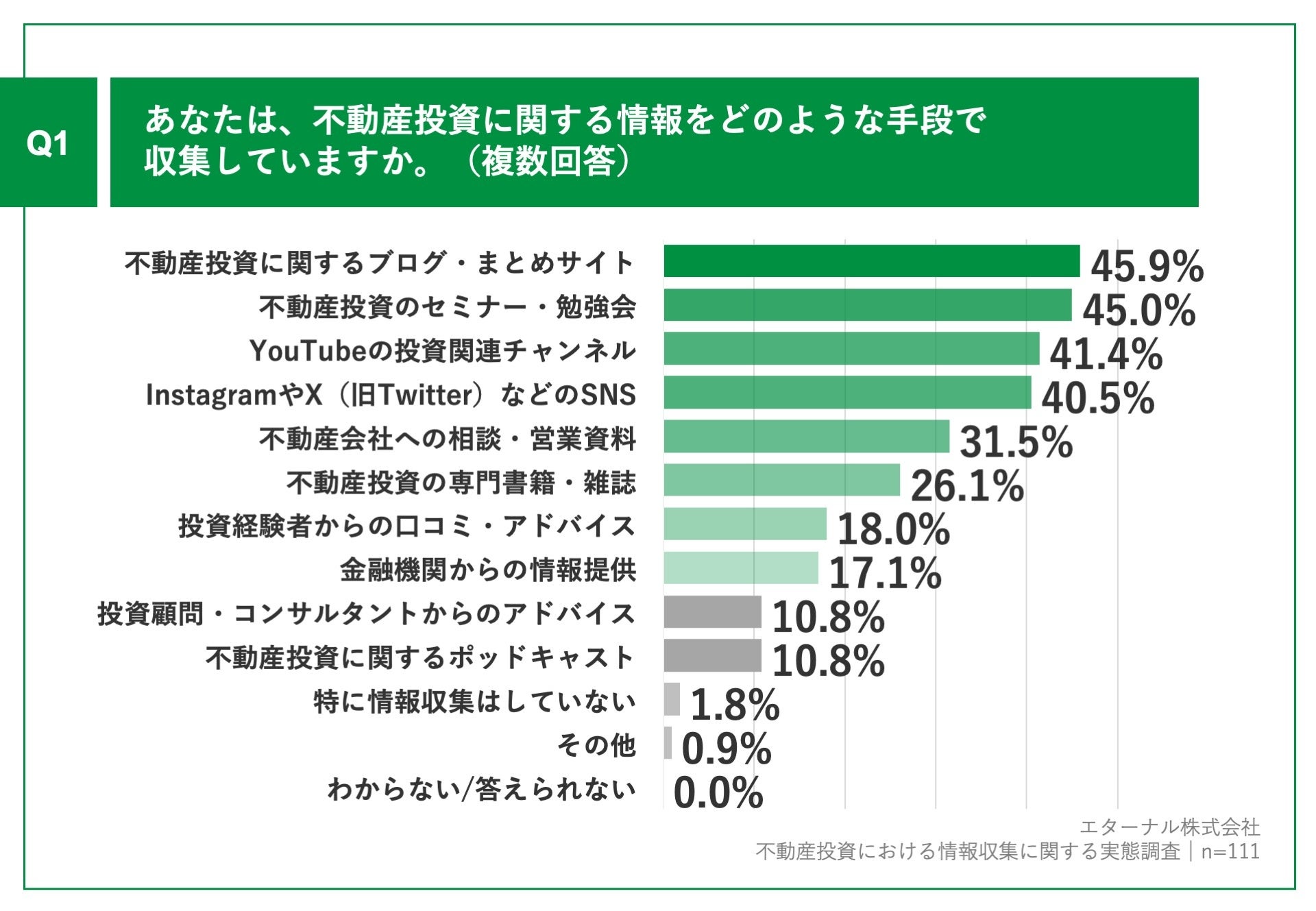 「Q1.あなたは、不動産投資に関する情報をどのような手段で収集していますか。(複数回答)」(n=111)と質問したところ、「不動産投資に関するブログ・まとめサイト」が45.9%、「不動産投資のセミナー・勉強会」が45.0%、「YouTubeの投資関連チャンネル」が41.4%という回答となりました。