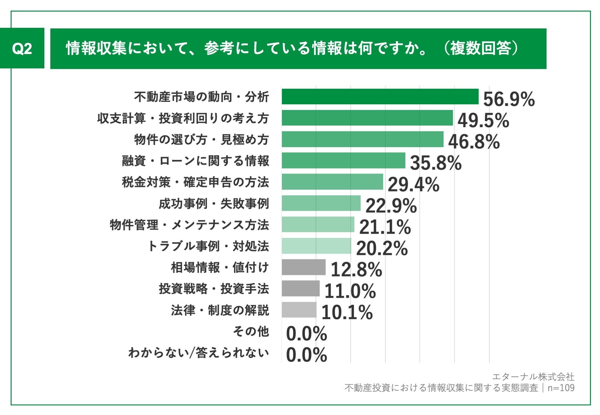 Q1で「特に情報収集はしていない」「わからない/答えられない」以外を回答した方に、「Q2.情報収集において、参考にしている情報は何ですか。(複数回答)」(n=109)と質問したところ、「不動産市場の動向・分析」が56.9%、「収支計算・投資利回りの考え方」が49.5%、「物件の選び方・見極め方」が46.8%という回答となりました。