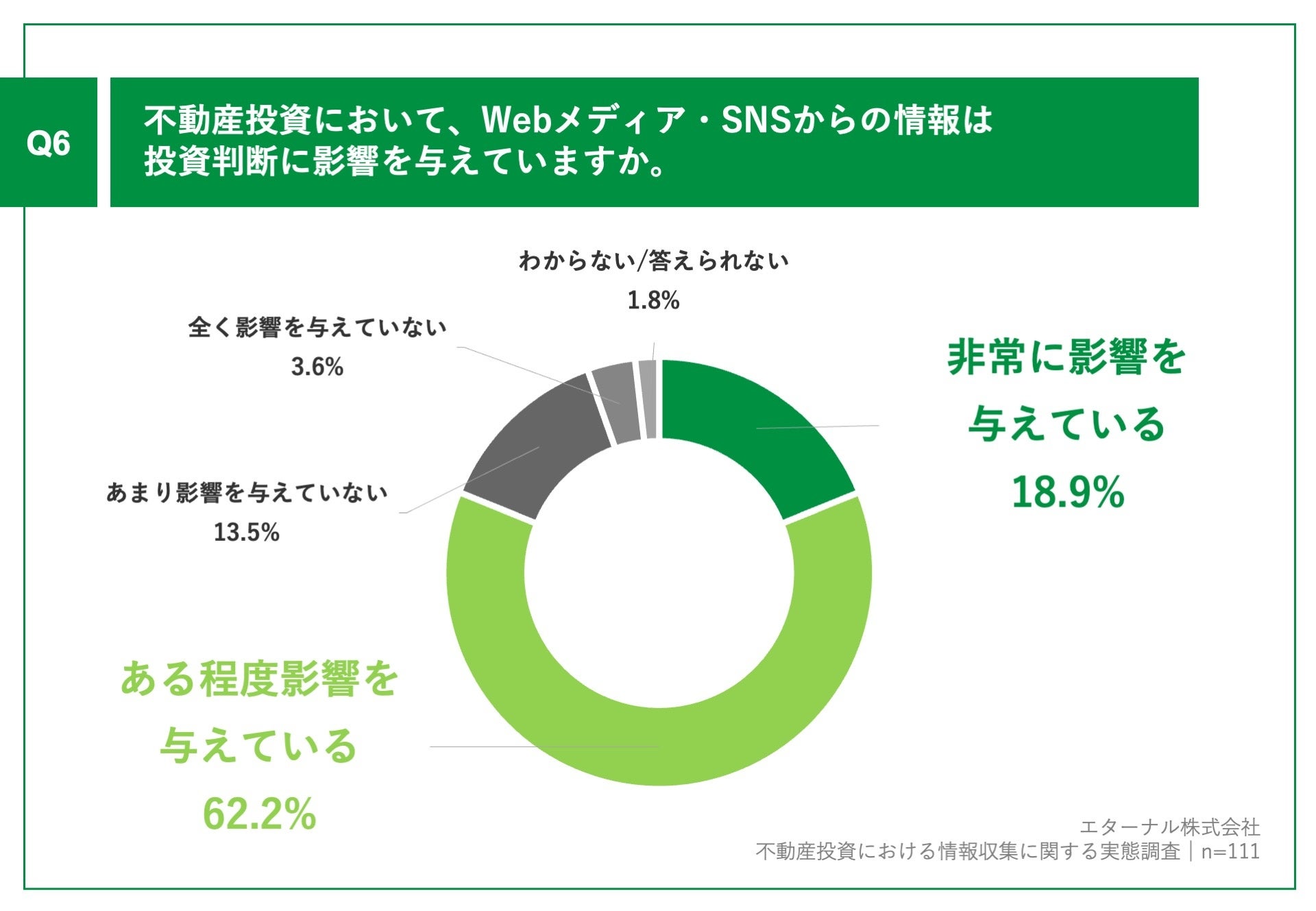 「Q6.不動産投資において、Webメディア・SNSからの情報は投資判断に影響を与えていますか。」(n=111)と質問したところ、「非常に影響を与えている」が18.9%、「ある程度影響を与えている」が62.2%という回答となりました。