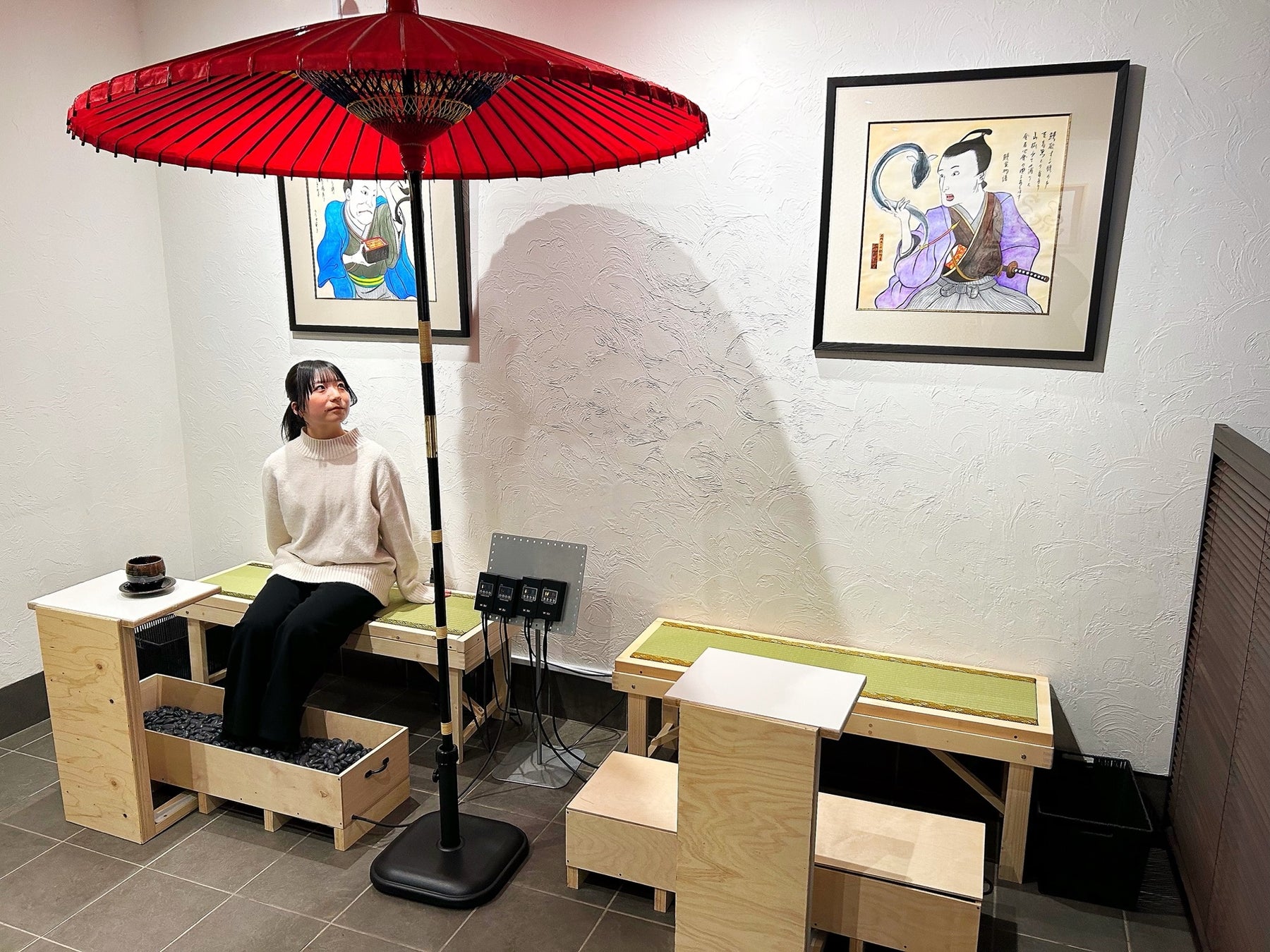 足湯桶の底と畳ベンチに遠赤外線シート「おひさまシート」を埋め込み、足を玉石とラジウム鉱石で埋めることで、足元とお尻が身体の内側からポカポカになります。