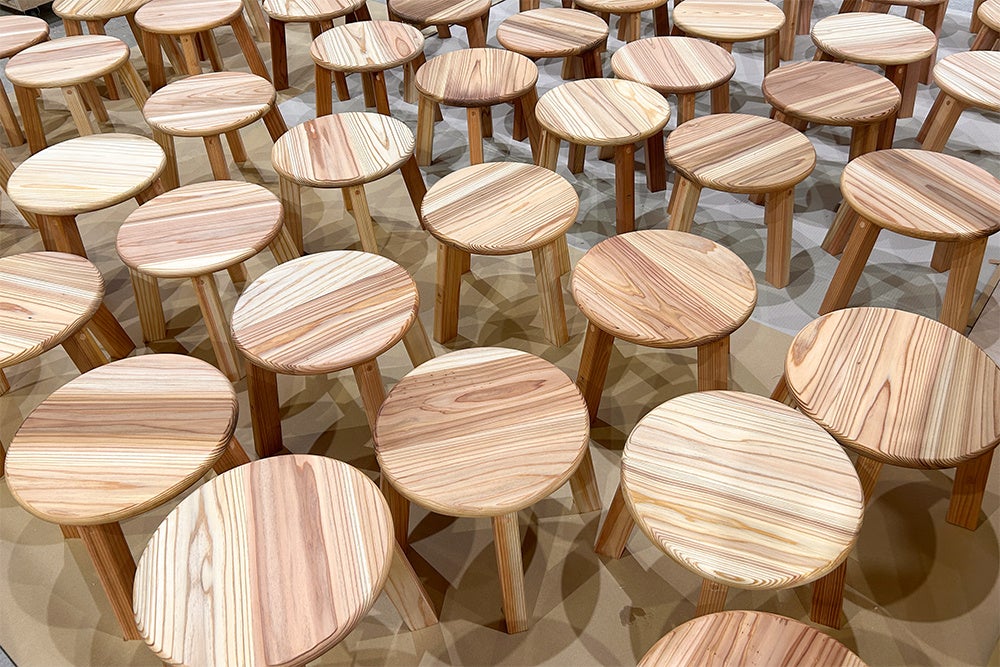 ・赤みのある紀州材スギを使用:スツールには、熊野材スギを使用。塗装を施すことで引き立つ自然な赤みが特徴で、空間に温かみをもたらします。従来多く用いていたヒノキとは異なる表情を持ち、木材の多様性や魅力に触れてもらえるように工夫しました。