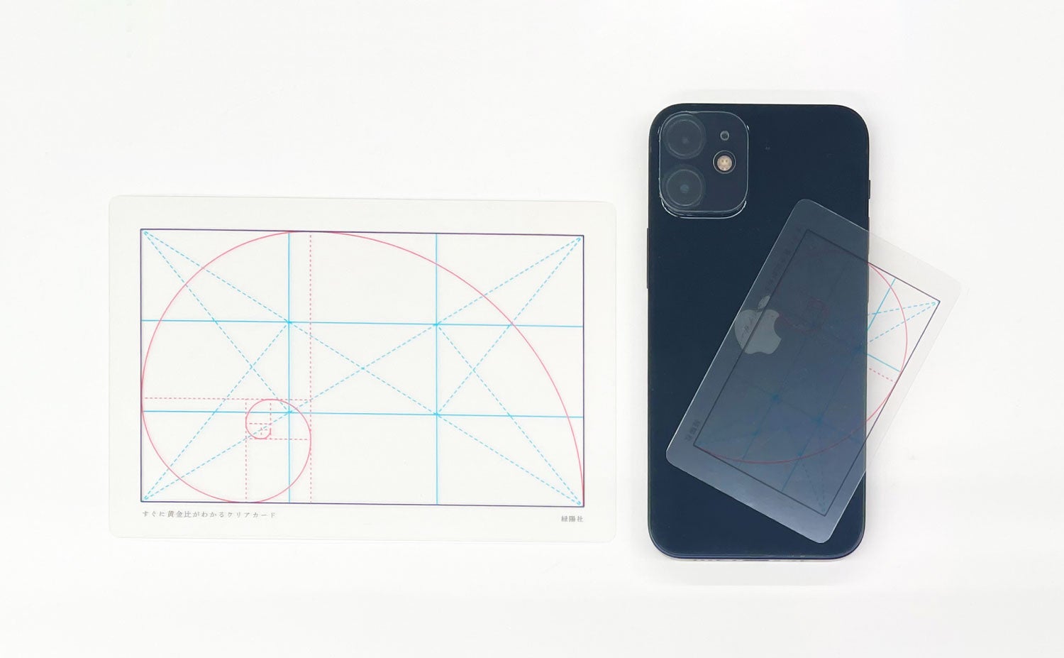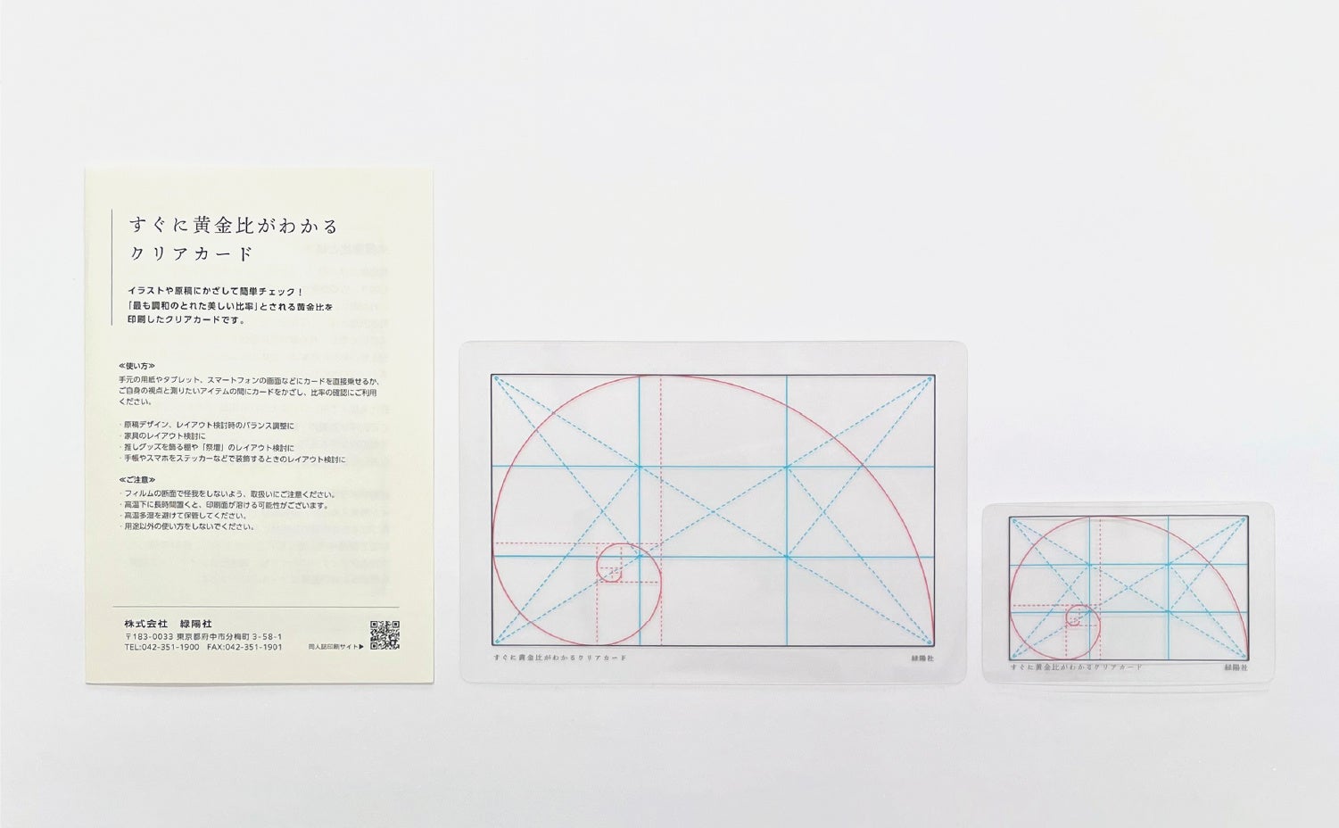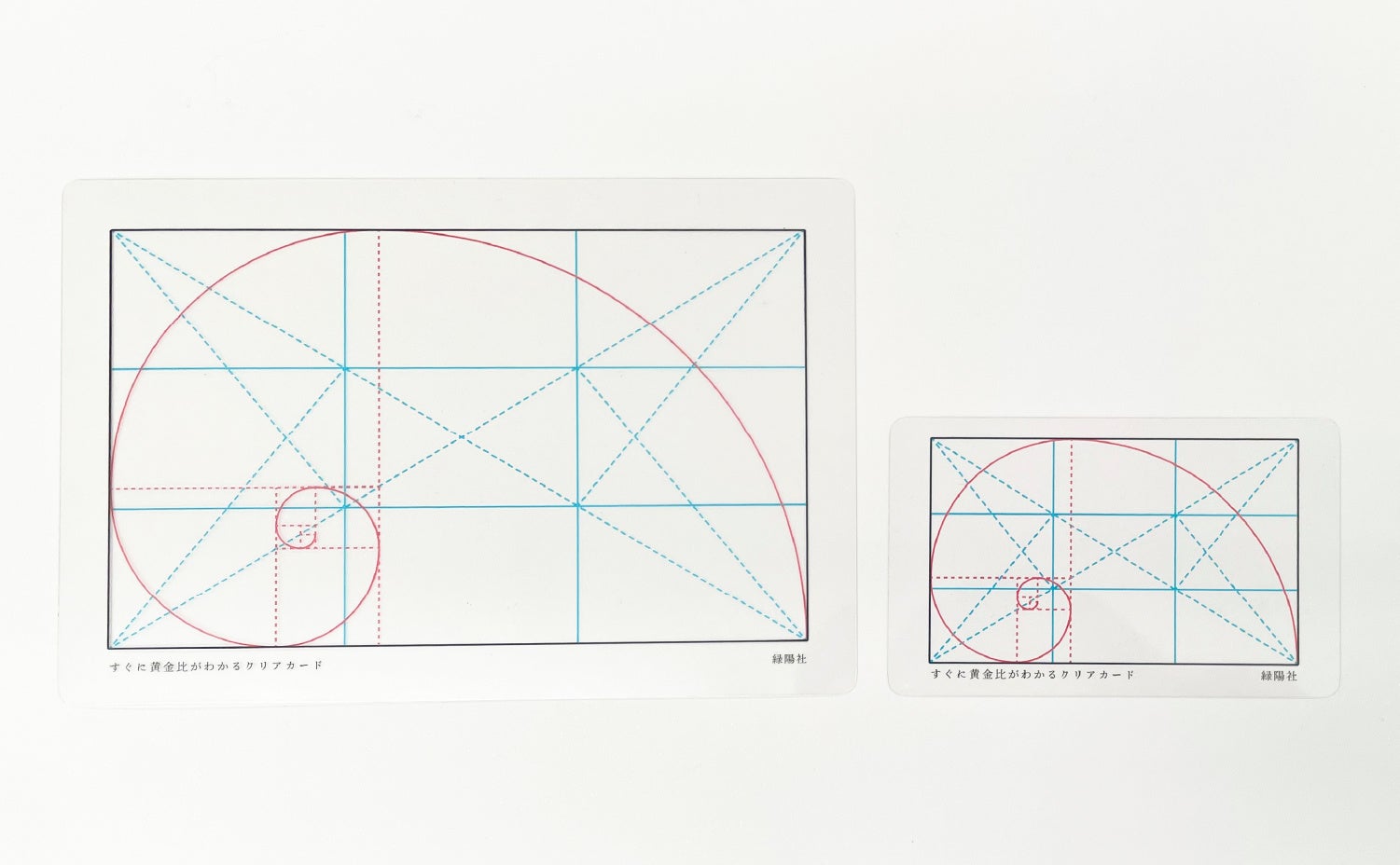 「すぐに黄金比がわかるクリアカード」は、透明フィルムに黄金比が印刷されたクリアカードです。古くより「最も調和のとれた美しい比率」と称される比率を、デザインに気軽に取り入れられるように、との思いから開発したものです。