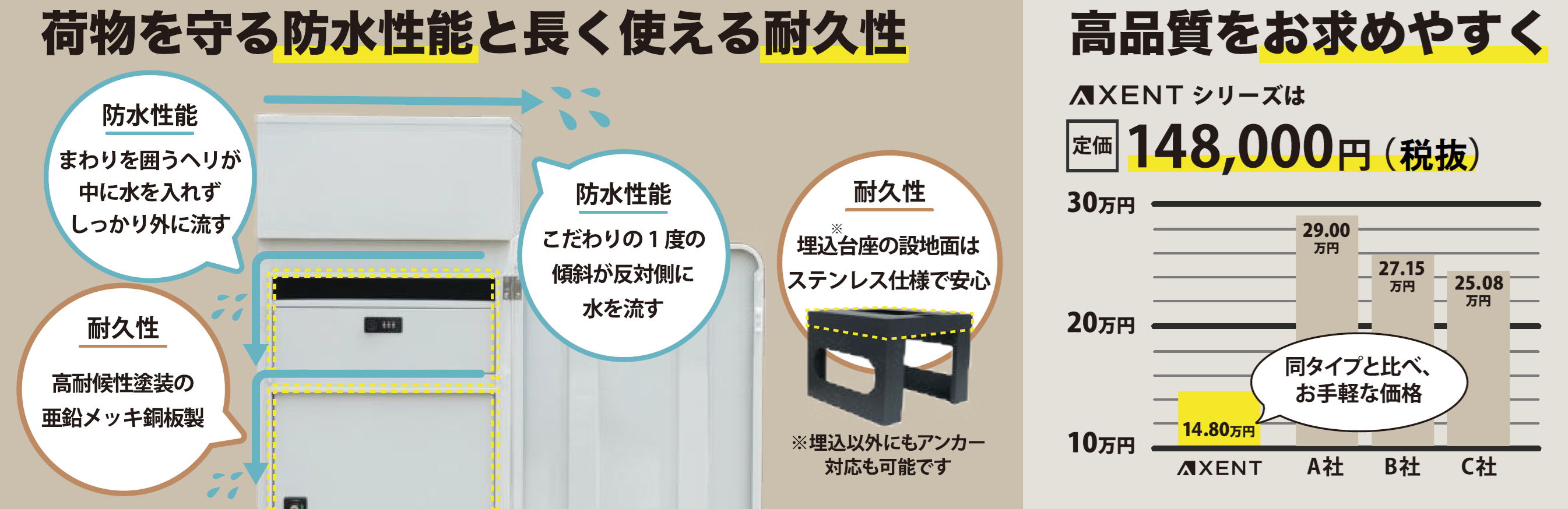 定価148,000円(税抜)という、圧倒的なコストパフォーマンスを実現。亜鉛メッキ鋼板に焼付塗装を施した高品質な本体素材と、露出部分にステンレスを使用した台座により、高い耐久性を確保しながらも、お求めになりやすい価格を実現しました。