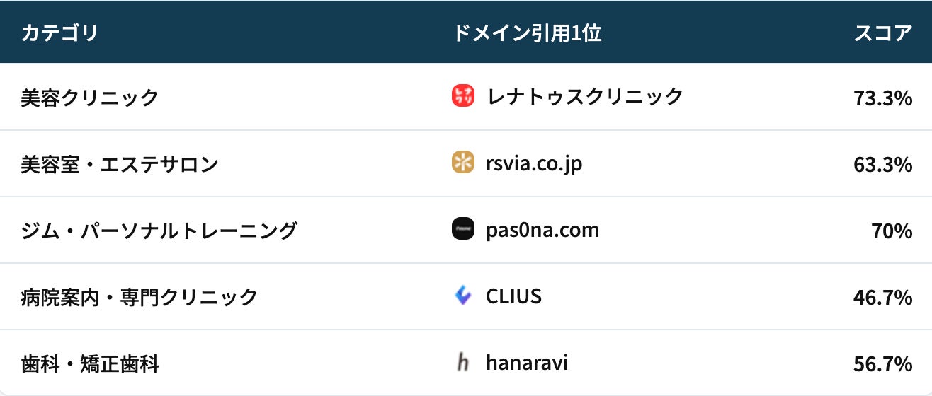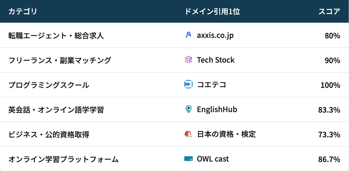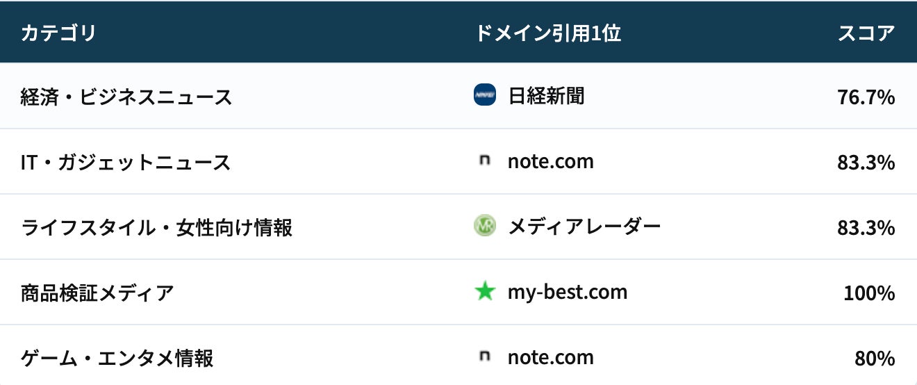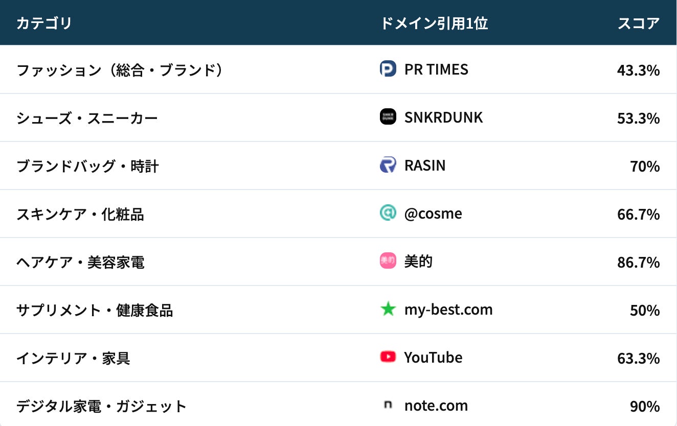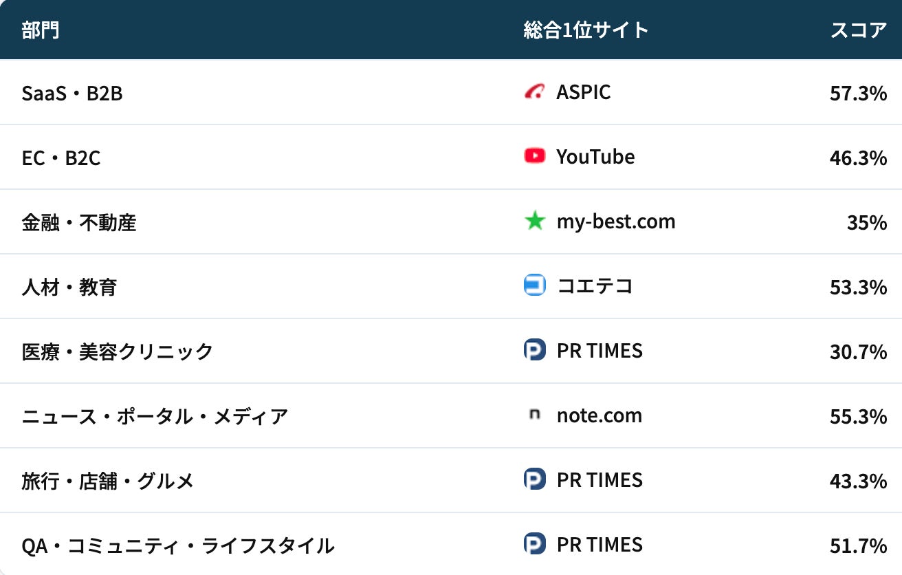 業界団体(ASPIC)、動画プラットフォーム(YouTube)、比較メディア(my-best.com)、教育メディア(コエテコ)、プレスリリース配信(PR TIMES)、UGCプラットフォーム(note.com)——AIが信頼する情報源は業界ごとに異なります。