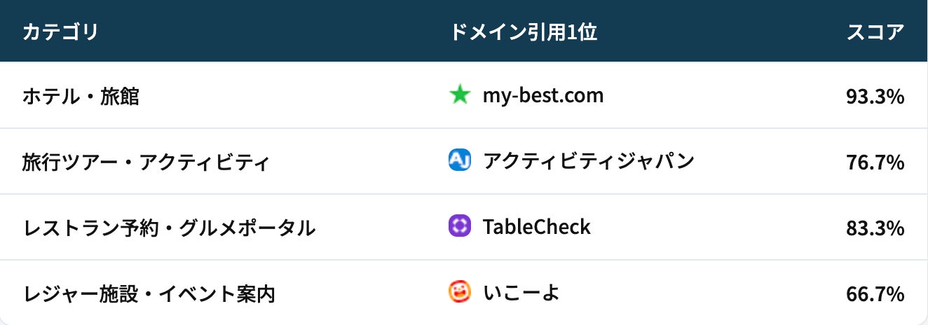 カテゴリごとに設計した多数のプロンプトを4つのAIプラットフォームに投げ、各ドメインが引用元として1回でも表示されたプロンプトの割合をスコアとしています。たとえばスコアが86.7%であれば、そのカテゴリに関する質問をAIに投げたとき、約9割の確率で引用元として表示されるということです。