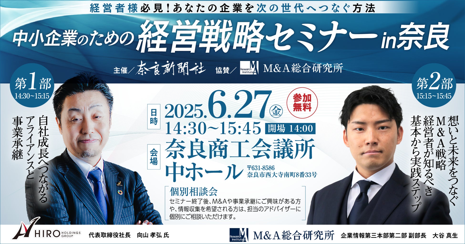 奈良新聞社(本社:奈良市法華寺町2番地4、田中篤則代表取締役社長)は、奈良県の中小企業の事業承継や成長戦略をテーマにしたセミナー講演を6月27日(金)に開催します。