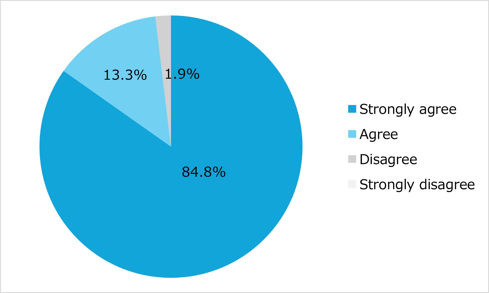 1. 日本と海外の教員にそれぞれ、「国際交流をすることによって、生徒は主体的に英語学習に取り組むようになったと思いますか」と伺いました。日本の教員の92.2%が「そう思う(とてもそう思う:55.0%、そう思う:37.2%)」と回答しました。また、海外の教員では「そう思う」と回答した割合は98.1%(とてもそう思う[Strongly agree]:84.8%、そう思う[Agree]:13.3%)でした。客観的に、国際交流による生徒の学習に対する姿勢の変化が感じられていることが分かります。