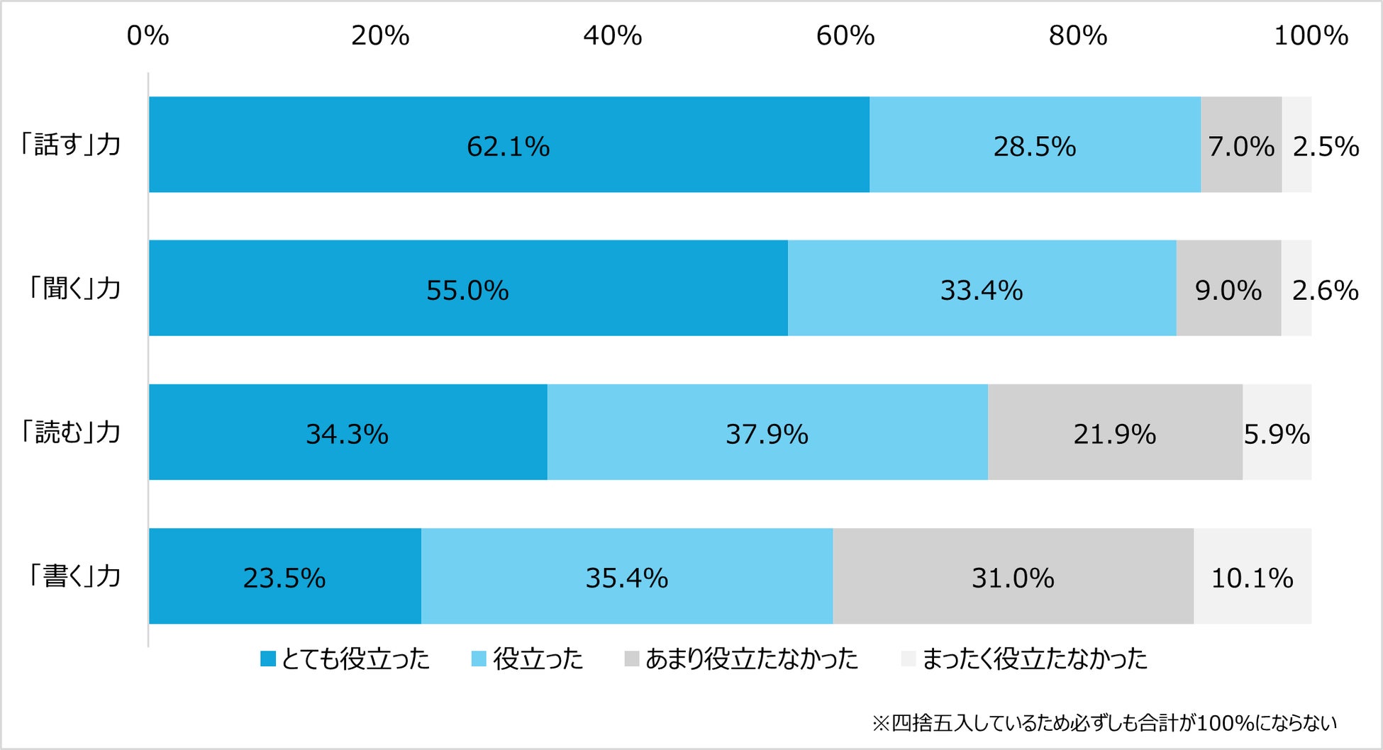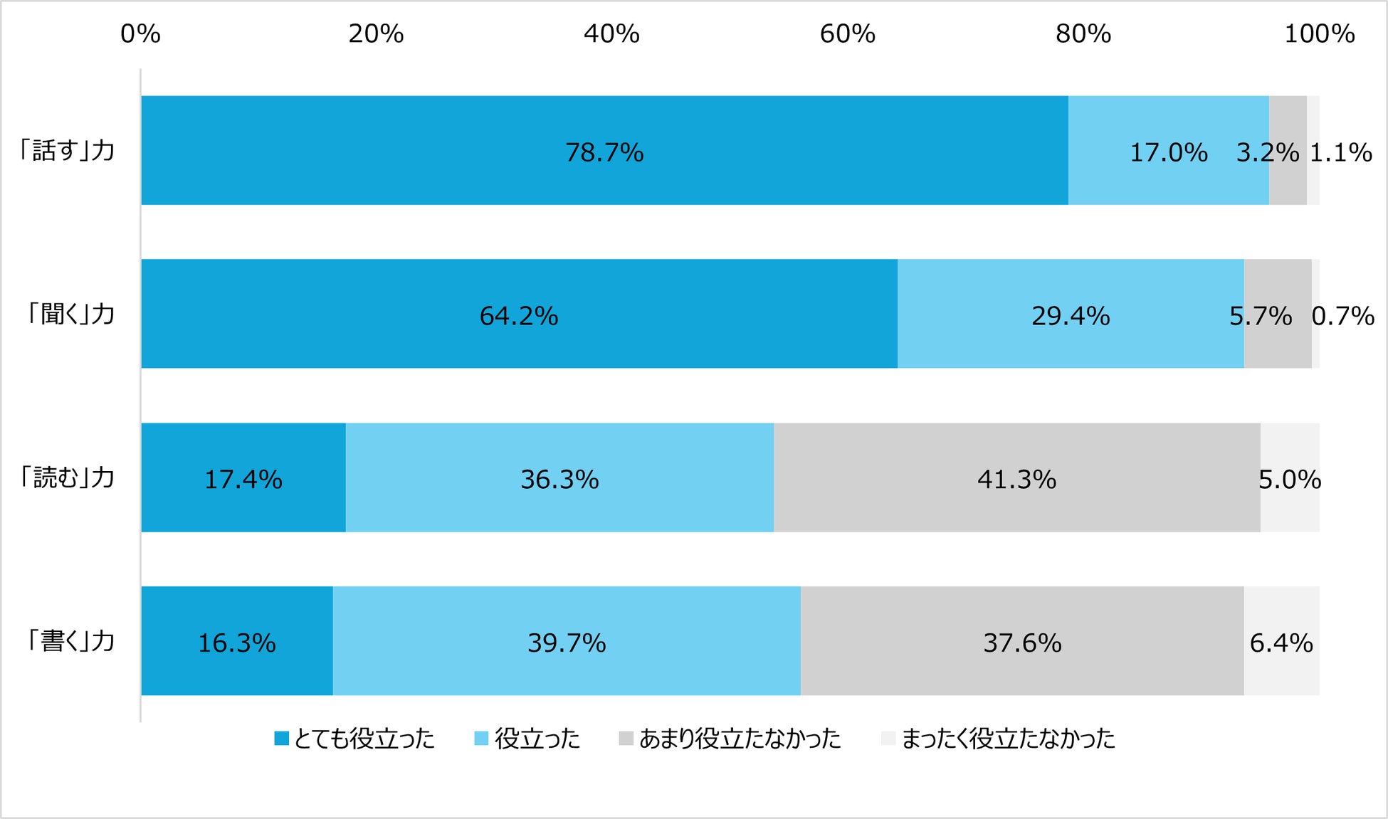 一方、「読む」力の向上については、国際交流が「役立った」と回答した教員は53.7%(とても役立った:17.4%、役立った:36.3%)だったのに対し、生徒は72.2%(とても役立った:34.3%、役立った:37.9%)と約20ポイントの差がつきました。今回の調査対象とした生徒が体験した国際交流では、実際の交流に先立って生徒が事前学習を行っており、その中で目的意識が明確になった結果、「読む」力の向上を実感することにつながったといえそうです。
