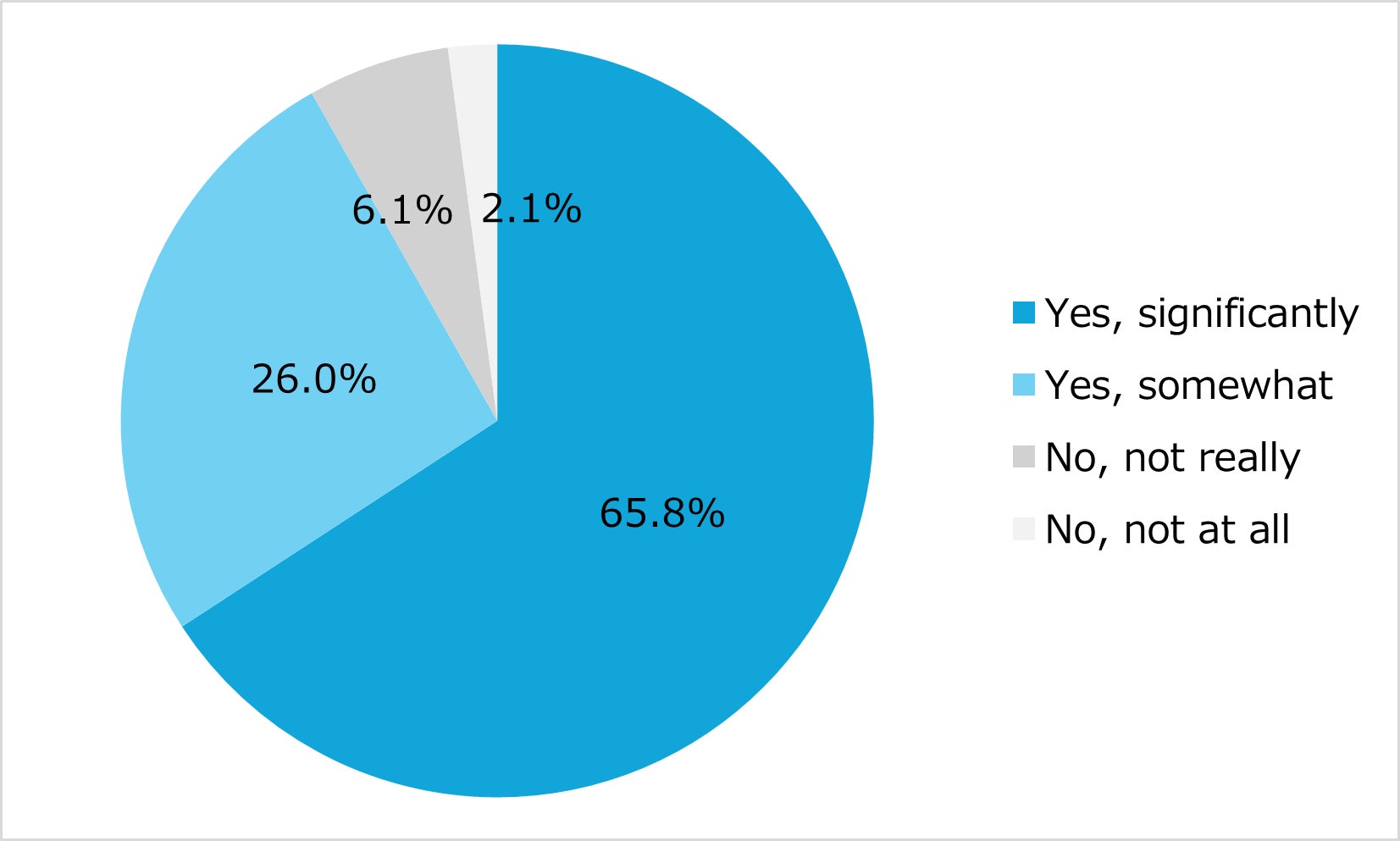 2. 日本と海外の生徒に対し、英語を使うことへの意欲の変化を伺いました。日本の生徒への「国際交流授業によって、英語をもっと上手に話したいと思いましたか」という問いに対して、肯定的に回答した割合は91.8%(とてもそう思う:66.3%、そう思う:25.5%)でした。海外の生徒への「英語をコミュニケーションツールとしてもっと活用したいと思うようになりましたか」という問いに対しても、91.8%が肯定回答(とてもそう思う[Yes, significantly]:65.8%、そう思う[Yes, somewhat]:26.0%)でした。