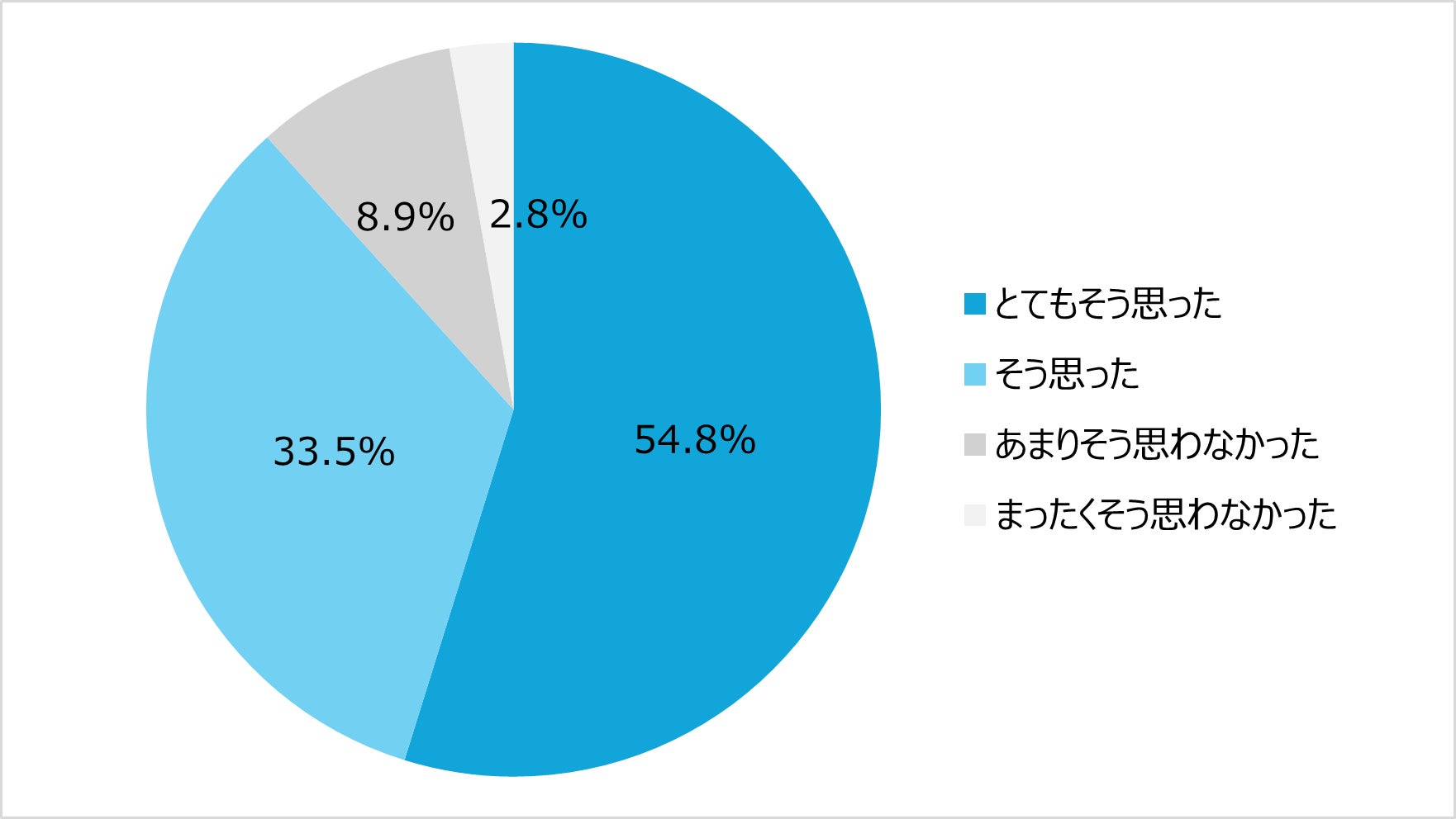 4. 日本国内の生徒に「国際交流授業によって、世界中の文化や生活についてもっと知りたいと思ったか」を伺ったところ、88.3%が「そう思った(とてもそう思った:54.8%、そう思った:33.5%)」と回答しました。国際交流の体験は、英語能力の向上や英語学習の意欲向上にとどまらず多文化理解への動機づけにつながっているといえます。