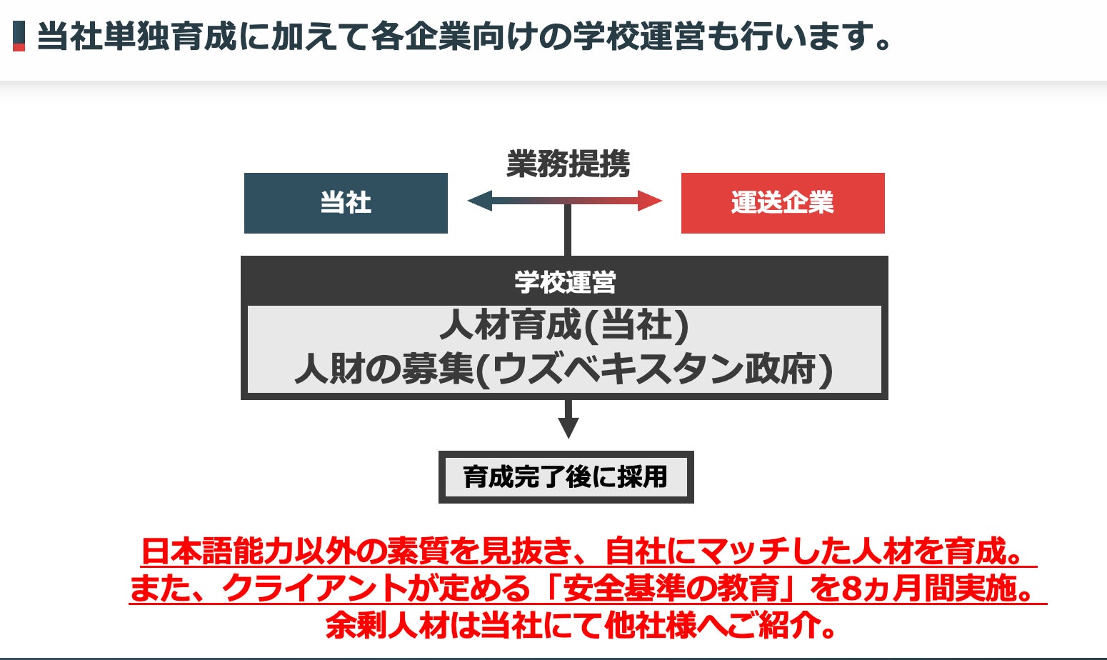 独自の運送業向け研修プログラムを用意、ウズベキスタンにて8ヶ月間の日本語教育と運転技能の習得を行い、安全運転技術を身につけた即戦力ドライバー(特定技能人材)を育成 ・運送業特有の課題を網羅したカリキュラム(長距離運転時の疲労管理、悪天候時の安全運転、都市部での駐車技術などを) ・日本の道路標識や交通ルールの徹底理解(座学、実地訓練) ・大型車両の実務的な運転技術の習得(実車を用いた実地研修) ・緊急対応トレーニング(事故や緊急時の対応を想定したシミュレーション) |