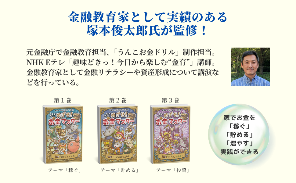 『めざせ!お金マスター』は、「働く」「使う」「増やす」というお金の3つの力を、体験的に楽しく学べる金融教育絵本です。1冊ごとにテーマが完結しており、家庭学習・授業・贈り物などさまざまなシーンで活用できます。