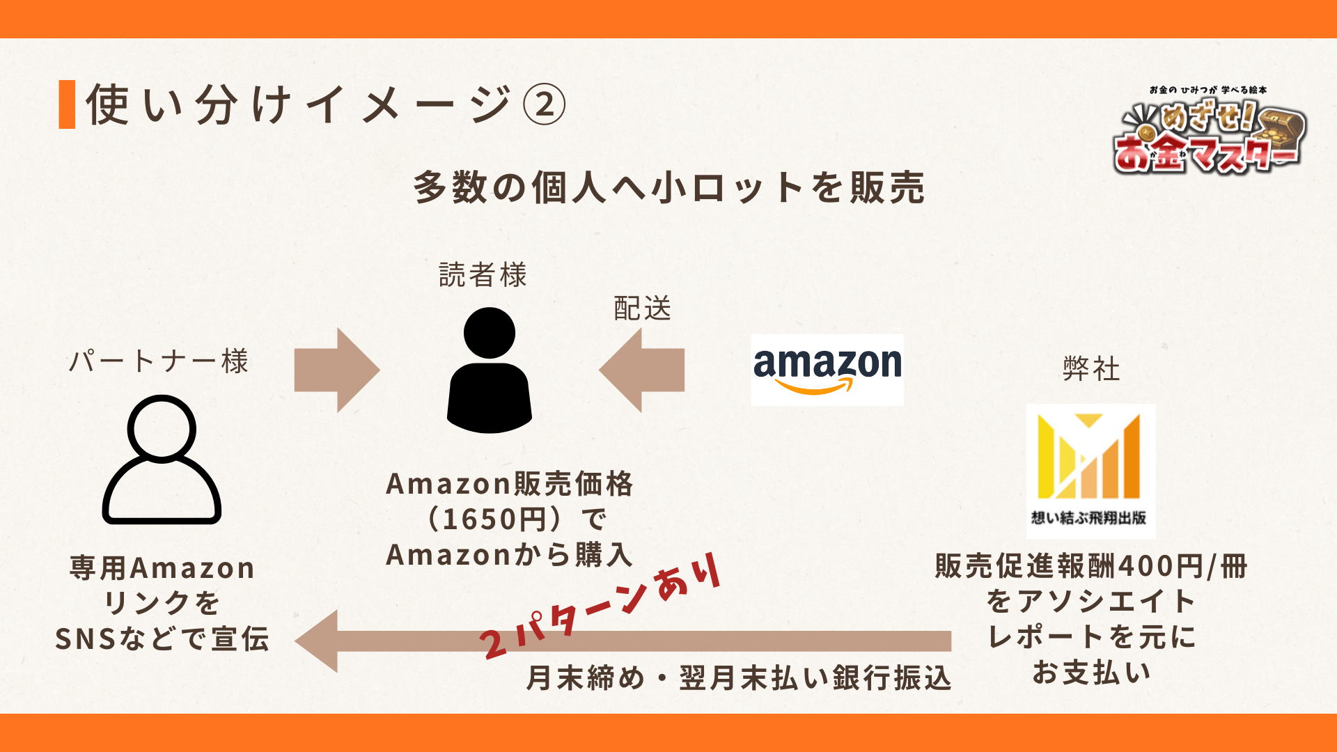 本制度は、絵本のペーパーバックを広める活動にご協力いただく個人・法人に対し、販売促進報酬をお支払いする仕組みです(電子書籍は対象外)。販売方法は2つから選択できます。