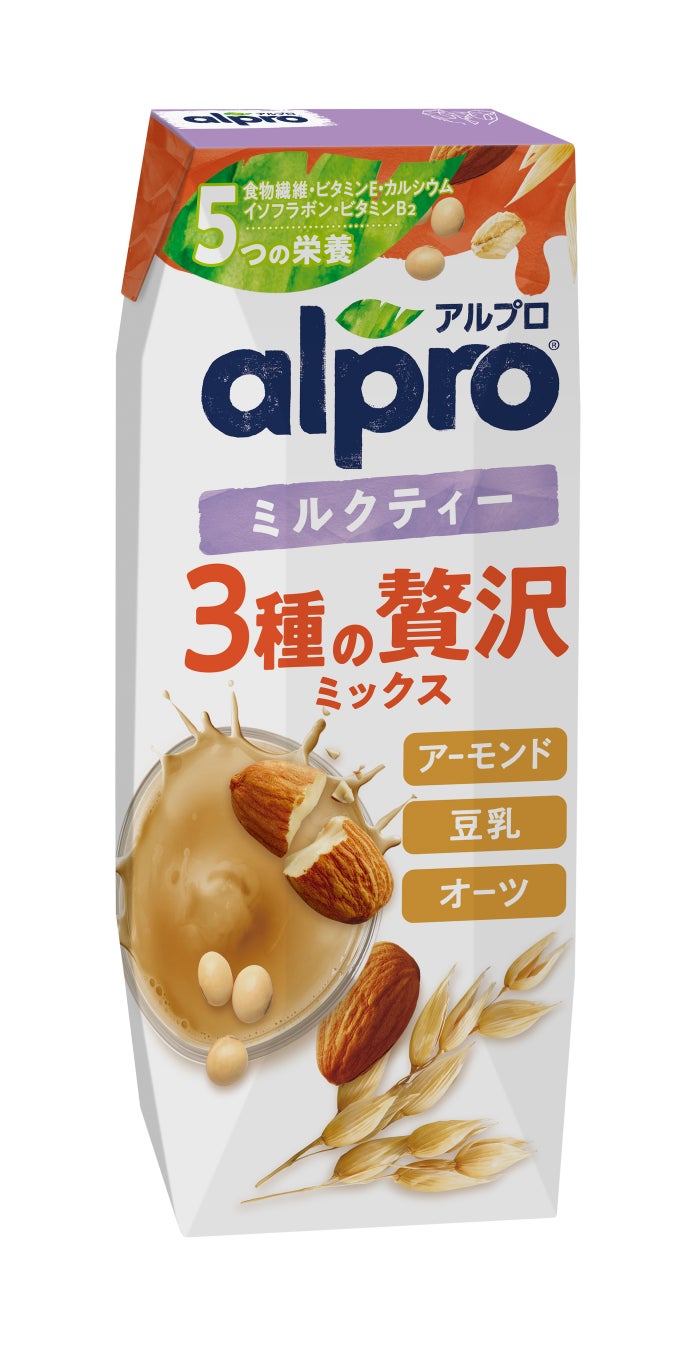 オーツミルク、アーモンドミルク、豆乳の3種の植物性ミルクをブレンドした「アルプロ 3種の贅沢ミックス」シリーズは、食物繊維、ビタミンE、カルシウム、イソフラボン、ビタミンB2の5つの栄養素を1本で摂取できます。フレーバータイプの「ミルクティー」には紅茶由来のポリフェノールも含んでいます。