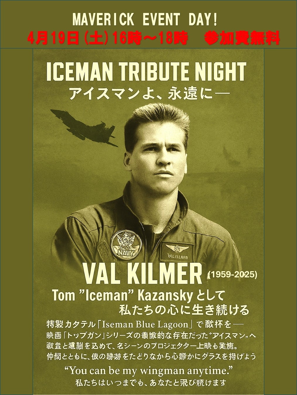 2025年4月19日(土)、江ノ電・江ノ島駅から徒歩4分のCafe&Bar MAVERICK(神奈川県鎌倉市腰越)にて、映画『TOP GUN MAVERICK』の登場人物 “アイスマン” を追悼するファンイベントを開催します。
