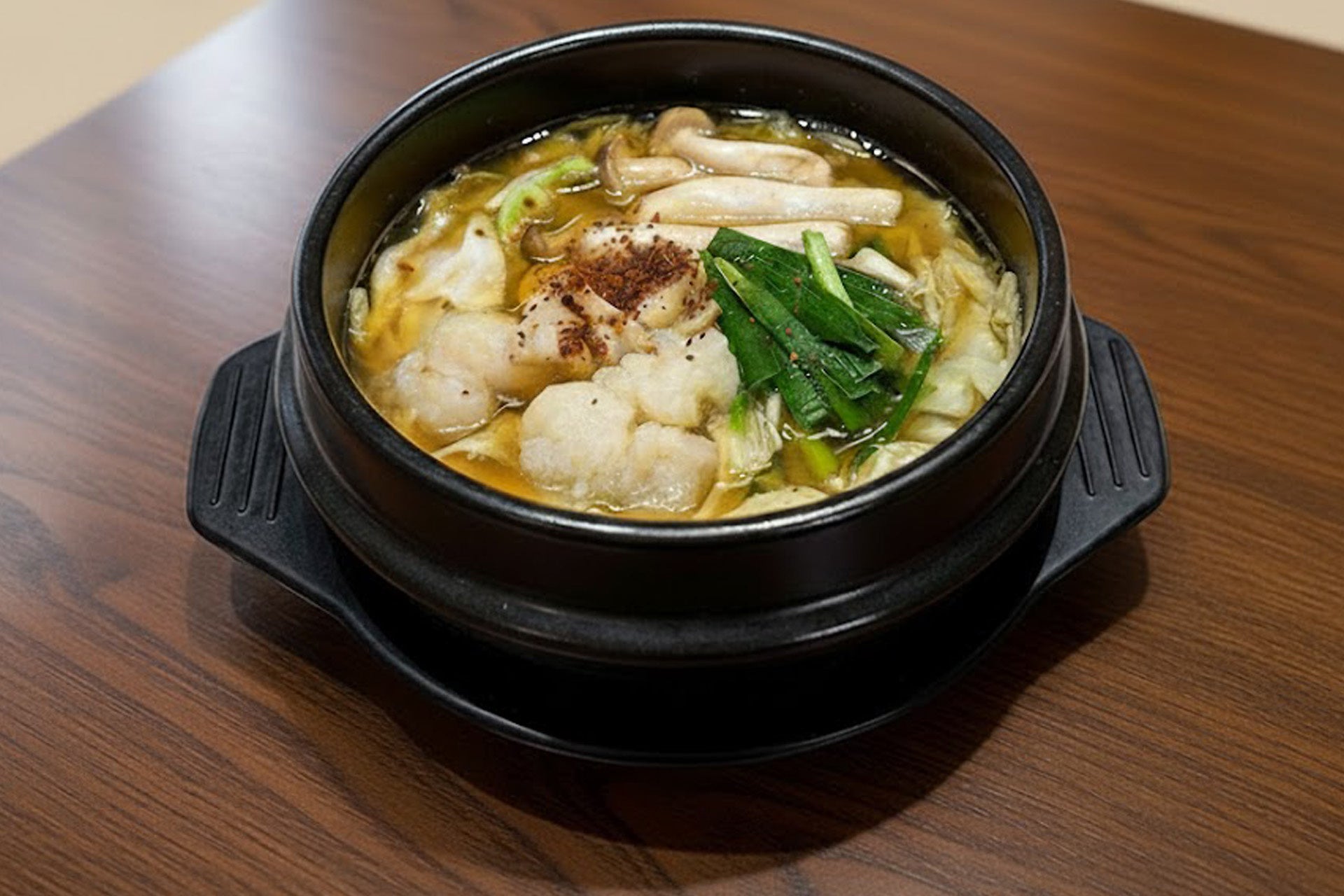 新鮮なもつをたっぷり使い、野菜の旨味が溶け込んだ特製出汁で煮込んだ熱々のもつ鍋は、冷えた体を芯から温めます。プリプリとしたもつの食感と、コク深いスープがやみつきになる一品です。